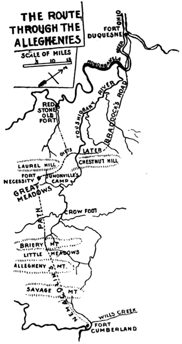 Will’s Creek was the last Virginian outpost, where Fort Cumberland was soon erected. Already the Ohio Company had located a store house at this point. Onward the Indian trail wound in and out through the Alleghenies, over the successive ranges known as Wills’, Savage and Meadow Mountains. From the latter it dropped down into Little Meadows. Here in the open ground, covered with rank grasses, the first of the western waters was crossed, a branch of the Youghiogeny River. From “Little Crossings,” as the ford was called, the narrow trail vaulted Negro Mountain and[Pg 6] came down upon the upper Youghiogeny, this ford here being named “Big Crossings.” Another climb over Briery Mountain brought the traveller down into Great Meadows, the largest tract of open land in the Alleghenies. By a zig-zag climb of five miles the summit of the last of the Allegheny ranges—Laurel Hill—was reached, where the path turned northward and followed the line of hills, by Christopher Gist’s clearing on what is known as Mount Braddock, toward the lower Youghiogeny, at “Stewart’s Crossing.” Thence the trail ran down the point of land where Pittsburg now lies in its clouds of smoke between the “Forks of the Ohio.”