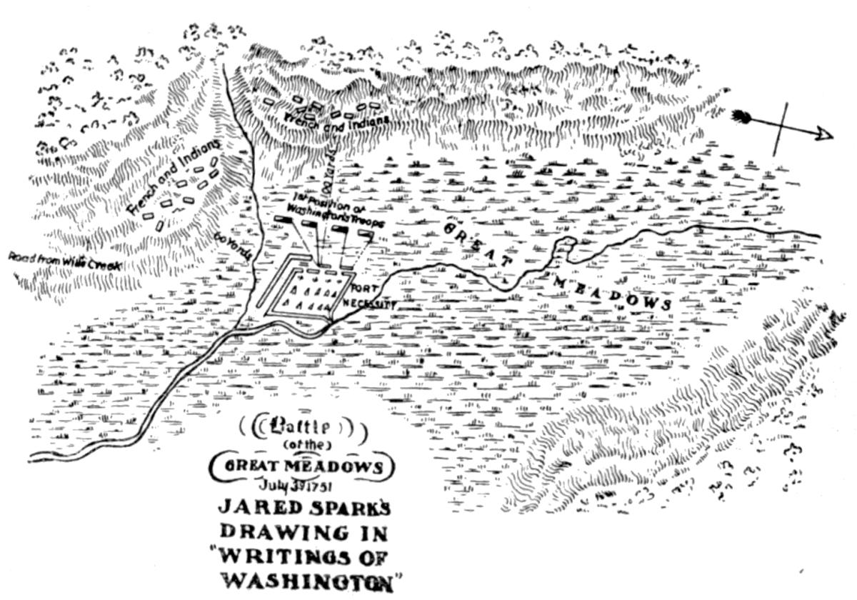 Thus the first blow of that long, bloody, seven year’s war was struck by the red-uniformed Virginians under Washington, at the bottom of that Allegheny valley. He immediately returned to Great Meadows and sent eastward to the belated Fry for reinforcements. On the 30th, the French prisoners were sent eastward to Virginia, and the construction of a fort was begun at Great Meadows, by erecting “small palisades.” This was completed by the following day, June 1st. Washington speaks of this fort in his Journal as “Fort Necessity” under date of June 25th. The name suggests the exigencies which led to its erection; lack of troops and provisions. On June 2nd Washington wrote in his Journal: “We had prayers in the Fort”; the name[Pg 37] Necessity may not have been used at first. On the 6th Gist arrived from Will’s Creek bringing the news of Colonel Fry’s death from injuries sustained by being thrown from his horse. Thus the command now devolved upon Washington who had been in actual command from the beginning. On the 9th the remainder of the Virginia regiment arrived from Will’s Creek, with the swivels, under Colonel Muse. On the day following Captain Mackaye arrived with the independent company of South Carolinians.