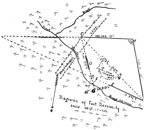The first recorded survey of Fort Necessity was made by Mr. Freeman Lewis, senior author, with Mr. James Veech, of “The Monongahela of Old,” in 1816. This survey was first reproduced in Lowdermilk’s “History of Cumberland”; it is described by Mr. Veech in “The Monongahela of Old,” and has been reproduced, as authoritative, by the authors of “Frontier Forts of Pennsylvania” published in 1895 by the State of Pennsylvania. The embankments are described thus by Mr. Veech on the basis of his collaborator’s survey: “It (Fort Necessity) was in the form of an obtuse-angled triangle of 105 degrees, having its base or hypothenuse upon the run. The line of the base was[Pg 49] about midway, sected or broken, and about two perches of it thrown across the run, connecting with the base by lines of the triangle. One line of the angle was six, the other seven perches; the base line eleven perches long, including the section thrown across the run. The lines embraced in all about fifty square perches of land on (or?) nearly one third of an acre.”