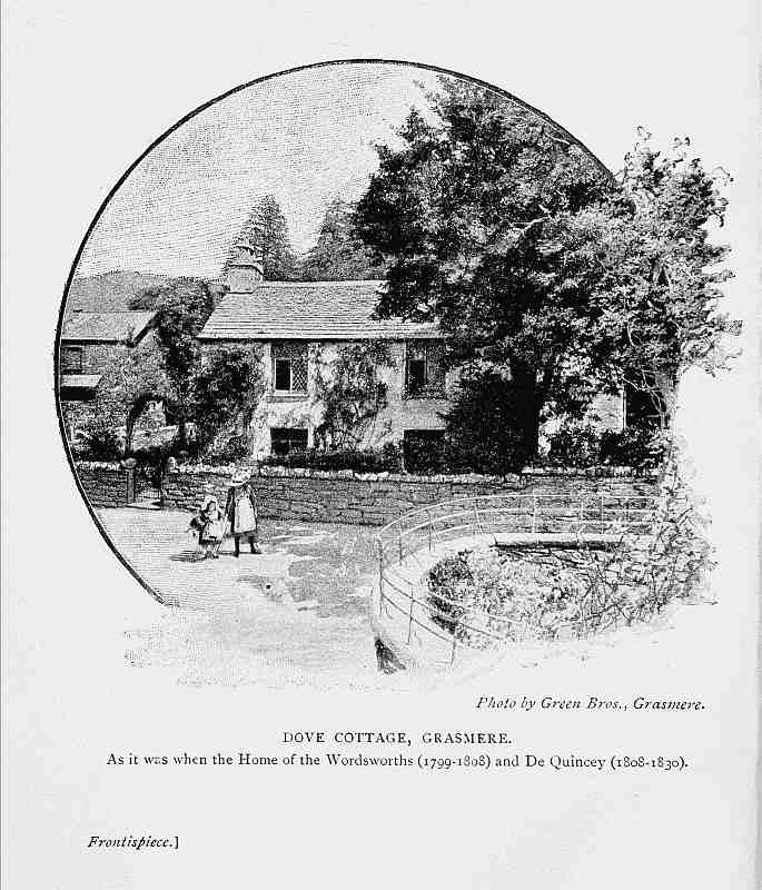 'Once I absolutely went forwards from Coniston to the very verge of Hammerscar, from which the whole Vale of Grasmere suddenly breaks upon the view in a style of almost theatrical surprise, with its lovely valley stretching before the eye in the distance, the lake lying immediately below, with its solemn ark-like island of four and a half acres in size seemingly floating on its surface, and its exquisite outline on the opposite shore, revealing all its little bays and wild sylvan margins, feathered to the edge with wild flowers and ferns. In one quarter, a little wood, stretching for about half a mile towards the outlet of the lake; more directly in opposition to the spectator, a few green fields; and beyond them, just two bowshots from the water, a little white cottage gleaming from the midst of trees, with a vast and seemingly never-ending series of ascents, rising above it to the height of more than three thousand feet. That little cottage was Wordsworth's from the time of his marriage, and earlier; in fact, from the beginning of the century to the year 1808. Afterwards, for many a year it was mine.'—Thomas De Quincey: Autobiographic Sketches