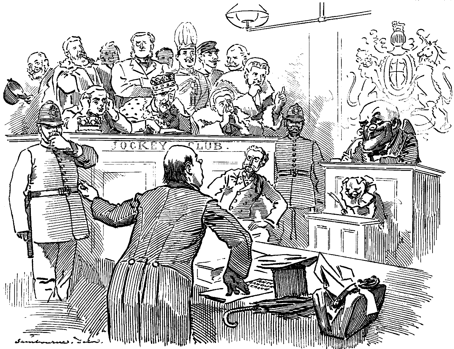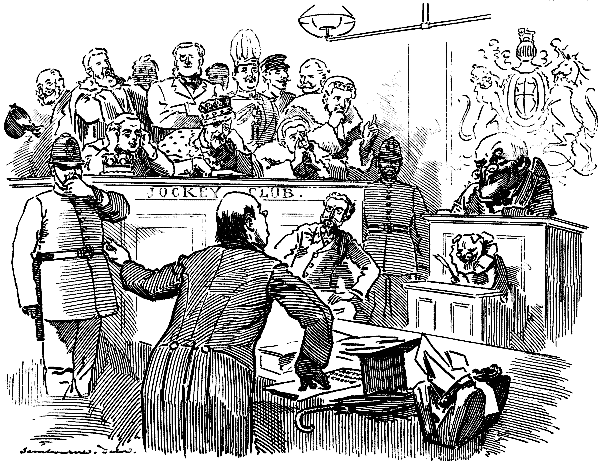 ["The Anti-Gambling League has decided to take proceedings against the Jockey Club.... In the view of the League every member of the Jockey Club is equally open to indictment."—Morning Post.]