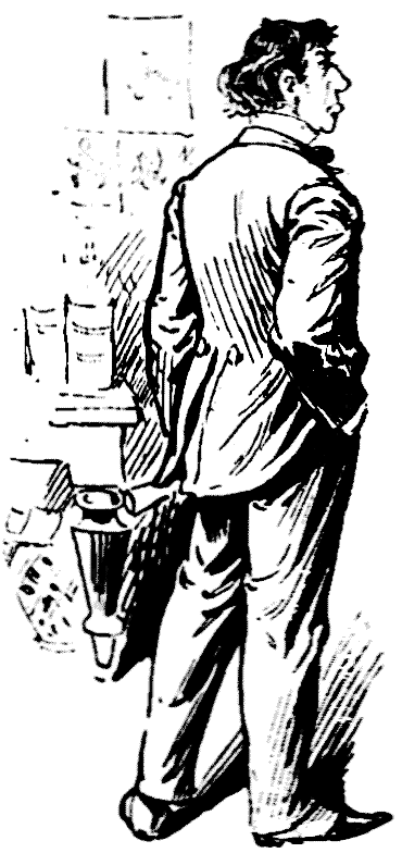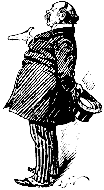 Mr. Punch looked up, and perceived before him a stalwart six-footer in flannels, broad-belted at the equator, and wearing broad-brim'd silken stove-pipe.