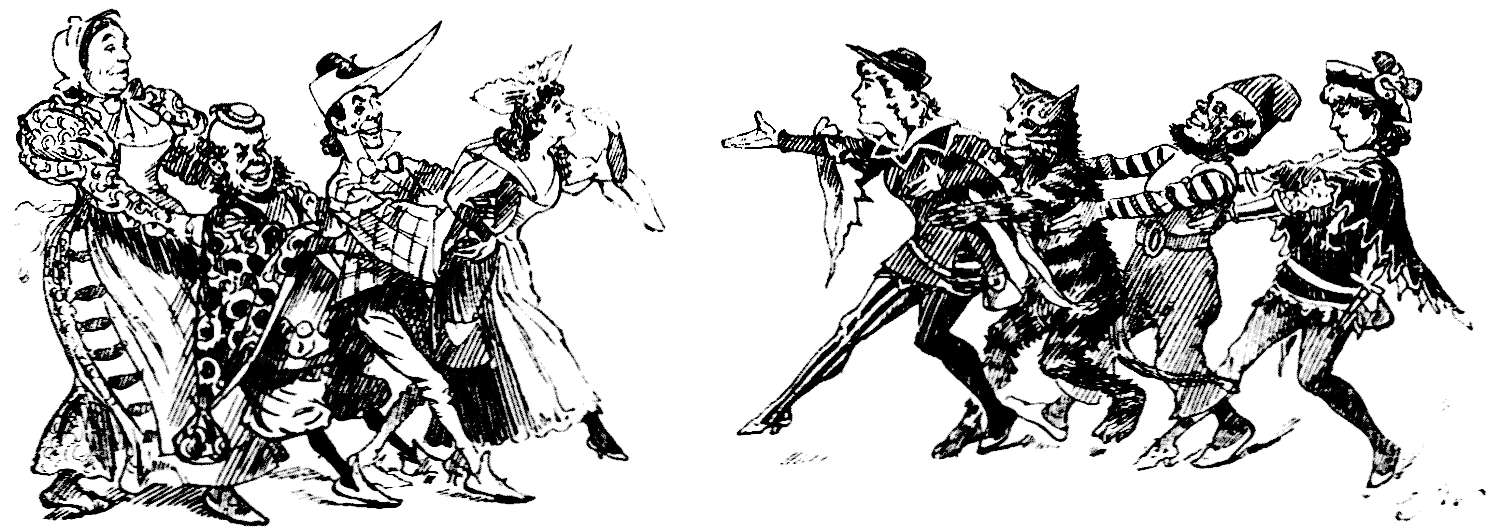 So much for pantomimic things in general, and now to turn to details in particular. The book of the words is decidedly a superior article. Hitherto when the Drury Lane Annual has contained a fault the mistake has been discovered in "the cackle." On former occasions it has been said (by the dyspeptic and consequently disappointed) that "the turns of the halls" have been too numerous. Those excellent comedians Messrs. Dan Leno and Herbert Campbell have sometimes been a little too much in evidence to suit every taste. In 1894-95 they have plenty to do, but only enough to satisfy the most fastidious. They are quite as amusing as usual, and when the curtain falls before "the transformation" people are rather inclined to ask for more than to say that they have had quite enough. This is the token of a good sign. Then the Brothers Griffiths are particularly pleasing. That member of the brethren who plays the cat is at once comic and pathetic. He makes Malkin quite a loveable character. Then Miss Ada Blanche, as Dick, is altogether a hero of romance. She may sing the old songs of the halls, but she tempers her comic vocalism with a touch of sentiment that makes the whole world kin after it has had its grin. Miss Marie Montrose, too, is winsome, and so are Misses Agnes Hewitt, Eva Westlake, and Madge Lucas. In fact, the opening is well played by "all concerned." It is a wonder that, after the first innings of the morning performance, they should have scored so heavily in the evening's representation. But score they do, and are likely to "continue the movement" until Easter.