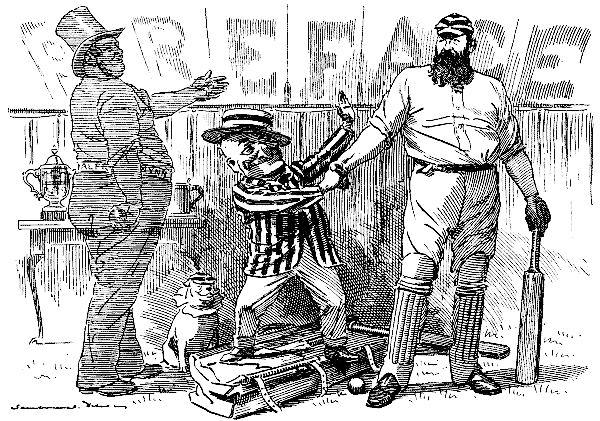 "Ah! There is another and a bigger Presentation afoot, I understand, thanks largely to a truly Gracious Prince," returned "the monarch of hard hitters." "A knighthood? Well, that's as it may be! Quite deserved indeed; but a [pg iv] 'King' hardly needs the addition of the lesser honour, and indeed W. G. won his spurs on the tented field years and years agone. But a National Testimonial! Faith, the Briton who grudges a subscription to that doesn't deserve to see a sixer run out, or drink a flagon of genuine Boniface at the 'Bat and Ball' on Broad Halfpenny. Only wish we old willow-wielders in the Elysian Fields could contribute each our obolus. By Castor and Pollux, here he comes!"
