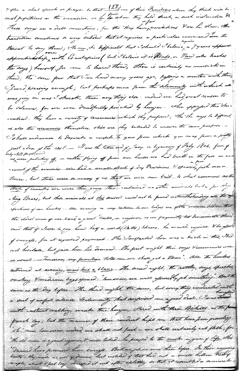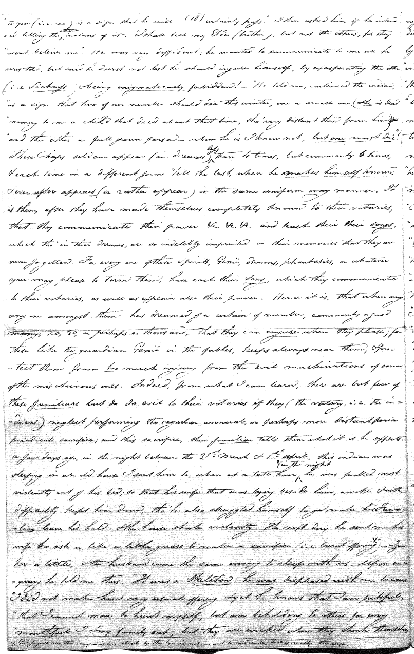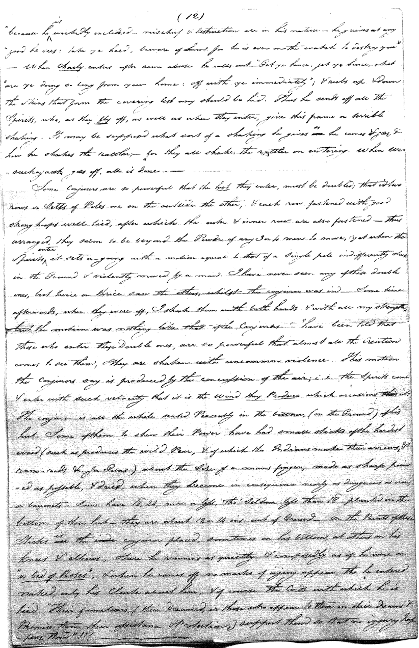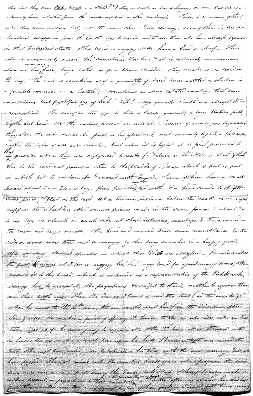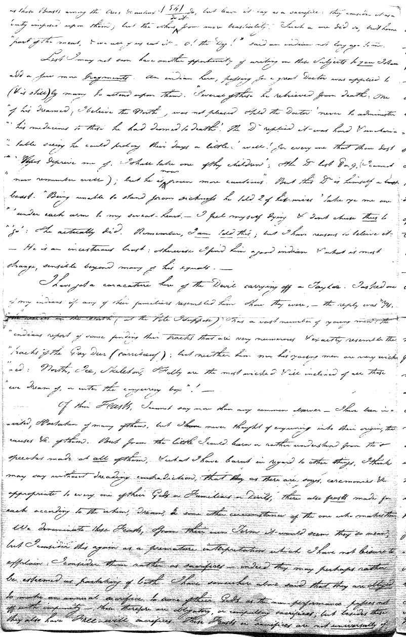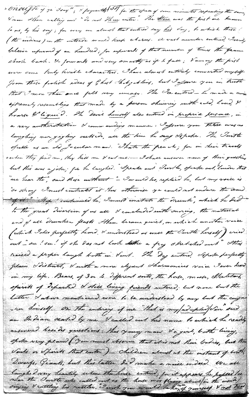 Enough of ye I say"; & frequently for the space of some minutes repeating the same, & now & then calling out "do not Thou enter." The Stone was the first one known to us, by his song; for every one almost that entered sang his song, to which those (the indians) on the outside would keep chorus. A vast number entered, I verily beleive upward of an hundred; for upwards of that number of times the frame shook back-&-forwards and very smartly as if to fall; & among the first were some truly terrible characters. I have almost entirely converted myself from these foolish ideas of Ghost & hobgoblins, but I assure you in truth that I more than once felt very uneasy. The Ice entered—he made a noise extremely resembling that made by a person shivering with cold, loud, & hoarse & liquid. The Devil himself also entered in propria persona, in a very authoritative & commanding manner: I assure you there was no laughing nor gigling outside, all the time he sang & spoke. The Turtle spoke as an old Jocular man. "I hate the french; for in their travels "when they find me, they kill me & eat me:—I shall answer none of their questions" but this was a joke; for he laughed. "Speake out Turtle, speake out, louder that "we hear the", said those without "—I would too, replied he, but my voice is "so strong I must contract it thus otherwise ye could not endure the sound "of it." "Hop! continued he, I must imitate the drunk", which he did to the great diversion of us all & concluded with snoring, the natural end of all drunken feasts & then became quiet, on which another voice (which I also perfectly heard & understood as well the Turtle herself) cried out--"see! see! if she does not look like a frog stretched out" & this raised a proper laugh both in & out. The Dog entered, & spoke perfectly plain & distinct, & with a more elegant & harmonious voice I ever heard in my life. Bears of 3 or 4 different sorts, the horse, moose, Skeletons, spirits of departed & still living friends entered; but none but the latter & above mentioned were to be understood by any but the conju- ror himself. On the entering of one "that is my (adopted) Son" said an Indian seated by me & called out his name to which he readily answered besides questions: this young man & a girl, both living, spoke very plain (you must observe that it is not their bodies, but their Souls or Spirits that enter)—Children almost at the instant of birth, Dwarfs, Giants; but this latter did make a noise indeed. We all laughed very heartily when the horse entered; for it appears he passed too near the Turtle who called out as the horse was flying about (in the inside) singing & rattling his rattler, "I wish you would take care of yourself & not tread