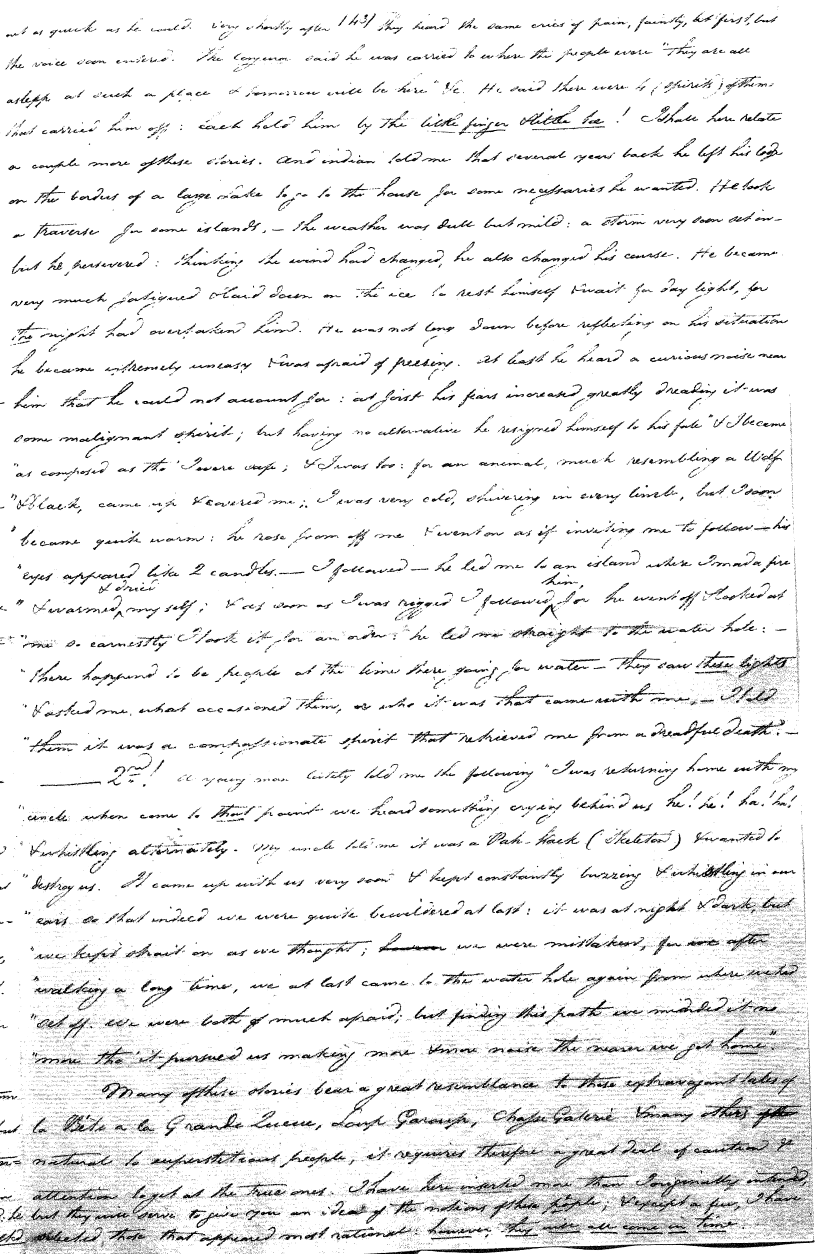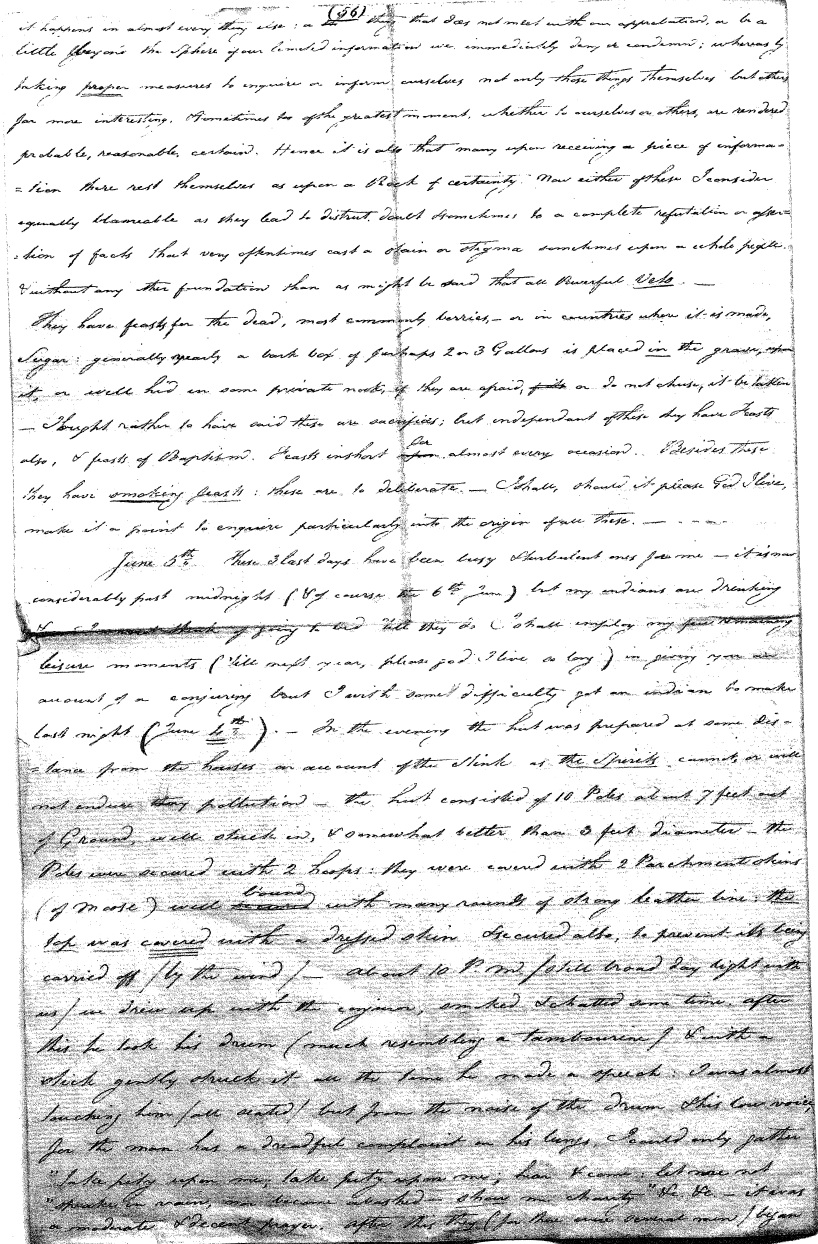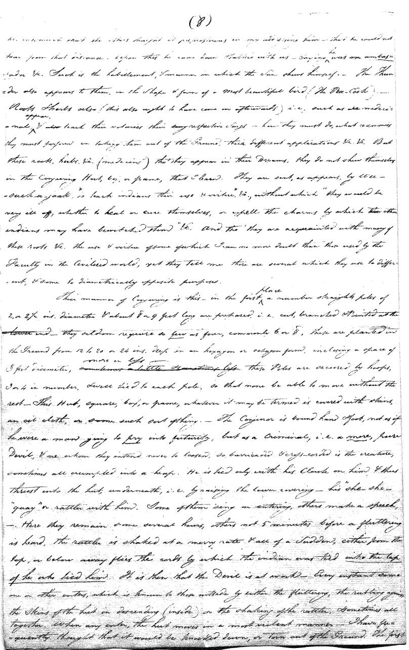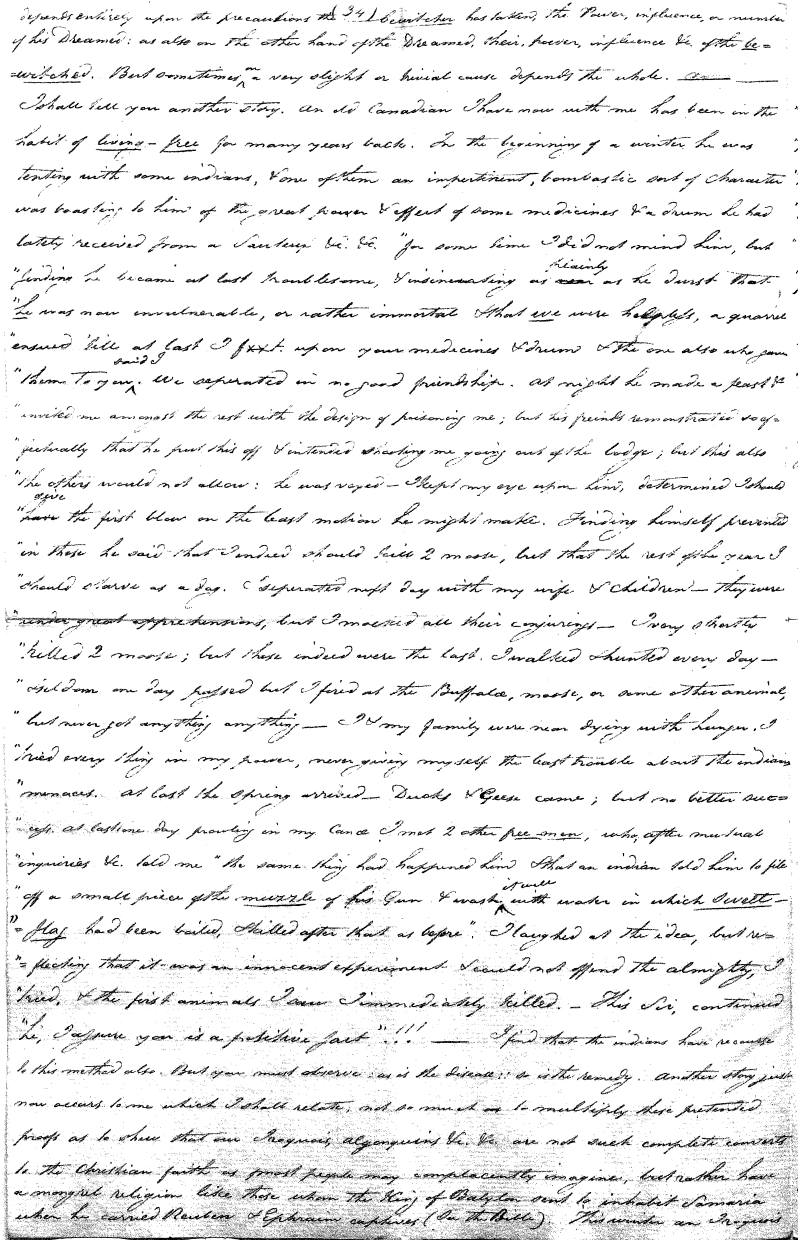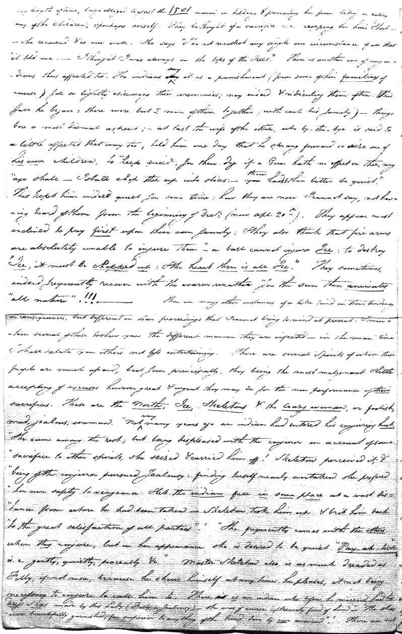 Enough of ye I say"; & frequently for the space of some minutes repeating the same, & now & then calling out "do not Thou enter." The Stone was the first one known to us, by his song; for every one almost that entered sang his song, to which those (the indians) on the outside would keep chorus. A vast number entered, I verily beleive upward of an hundred; for upwards of that number of times the frame shook back-&-forwards and very smartly as if to fall; & among the first were some truly terrible characters. I have almost entirely converted myself from these foolish ideas of Ghost & hobgoblins, but I assure you in truth that I more than once felt very uneasy. The Ice entered—he made a noise extremely resembling that made by a person shivering with cold, loud, & hoarse & liquid. The Devil himself also entered in propria persona, in a very authoritative & commanding manner: I assure you there was no laughing nor gigling outside, all the time he sang & spoke. The Turtle spoke as an old Jocular man. "I hate the french; for in their travels "when they find me, they kill me & eat me:—I shall answer none of their questions" but this was a joke; for he laughed. "Speake out Turtle, speake out, louder that "we hear the", said those without "—I would too, replied he, but my voice is "so strong I must contract it thus otherwise ye could not endure the sound "of it." "Hop! continued he, I must imitate the drunk", which he did to the great diversion of us all & concluded with snoring, the natural end of all drunken feasts & then became quiet, on which another voice (which I also perfectly heard & understood as well the Turtle herself) cried out--"see! see! if she does not look like a frog stretched out" & this raised a proper laugh both in & out. The Dog entered, & spoke perfectly plain & distinct, & with a more elegant & harmonious voice I ever heard in my life. Bears of 3 or 4 different sorts, the horse, moose, Skeletons, spirits of departed & still living friends entered; but none but the latter & above mentioned were to be understood by any but the conju- ror himself. On the entering of one "that is my (adopted) Son" said an Indian seated by me & called out his name to which he readily answered besides questions: this young man & a girl, both living, spoke very plain (you must observe that it is not their bodies, but their Souls or Spirits that enter)—Children almost at the instant of birth, Dwarfs, Giants; but this latter did make a noise indeed. We all laughed very heartily when the horse entered; for it appears he passed too near the Turtle who called out as the horse was flying about (in the inside) singing & rattling his rattler, "I wish you would take care of yourself & not tread