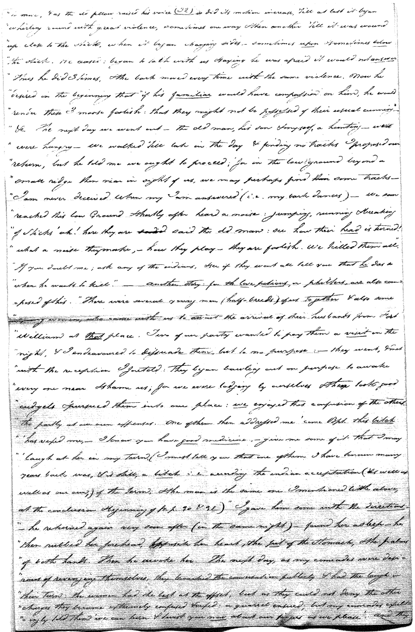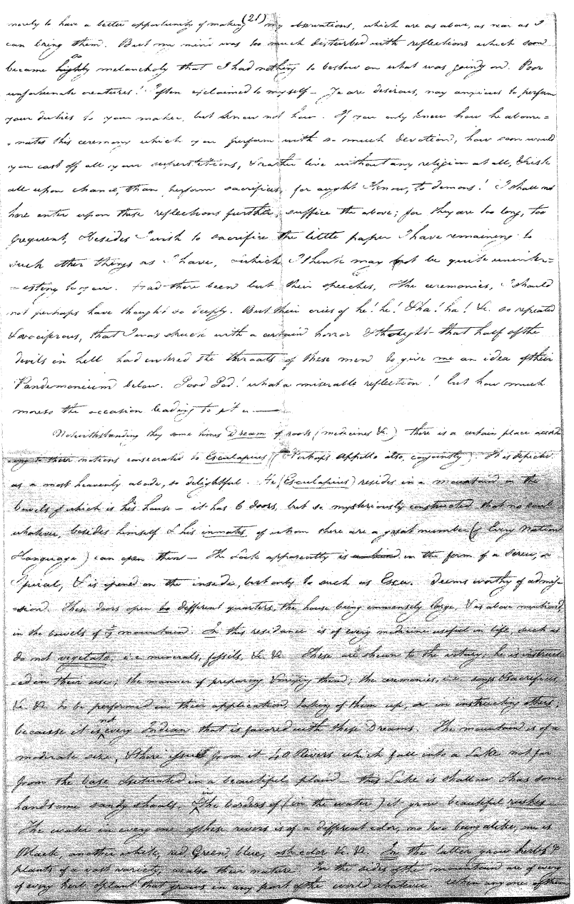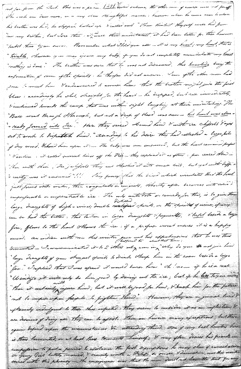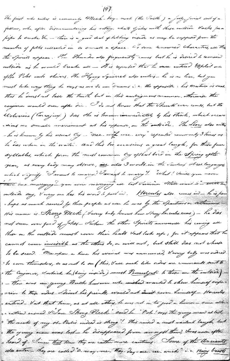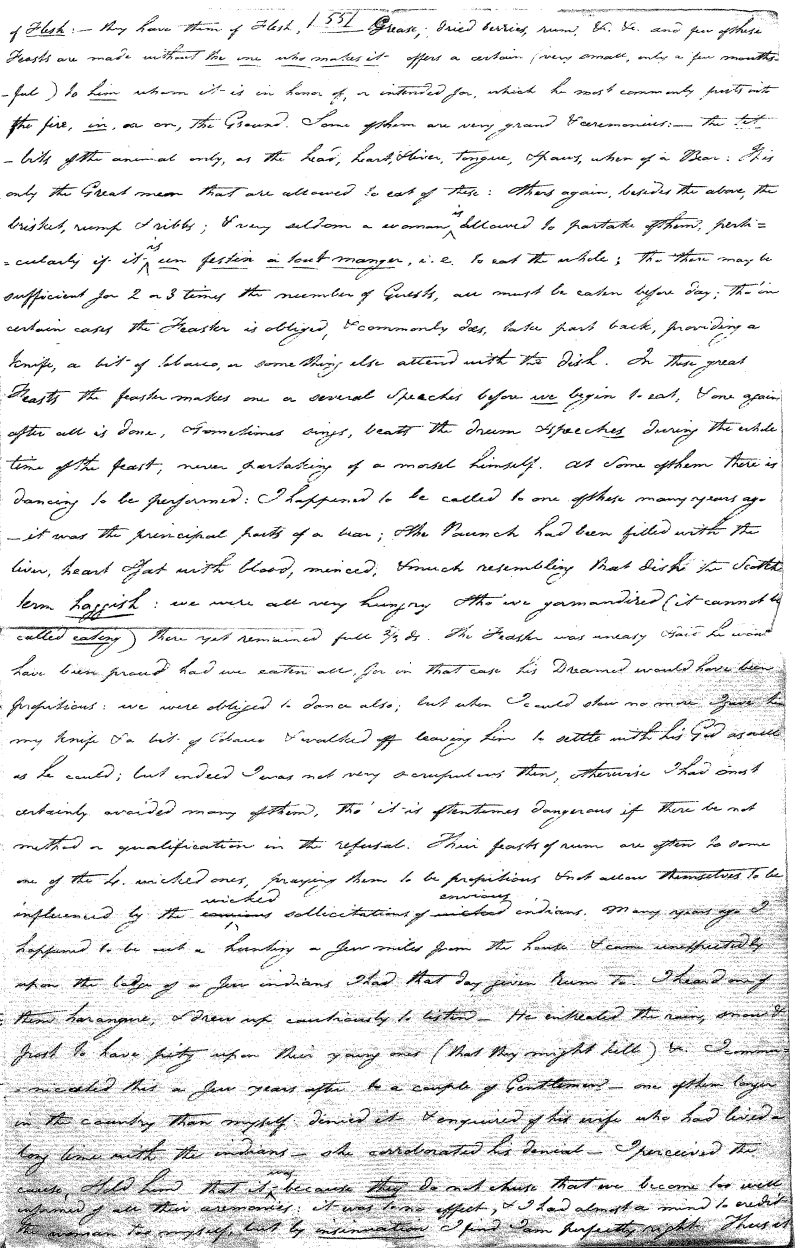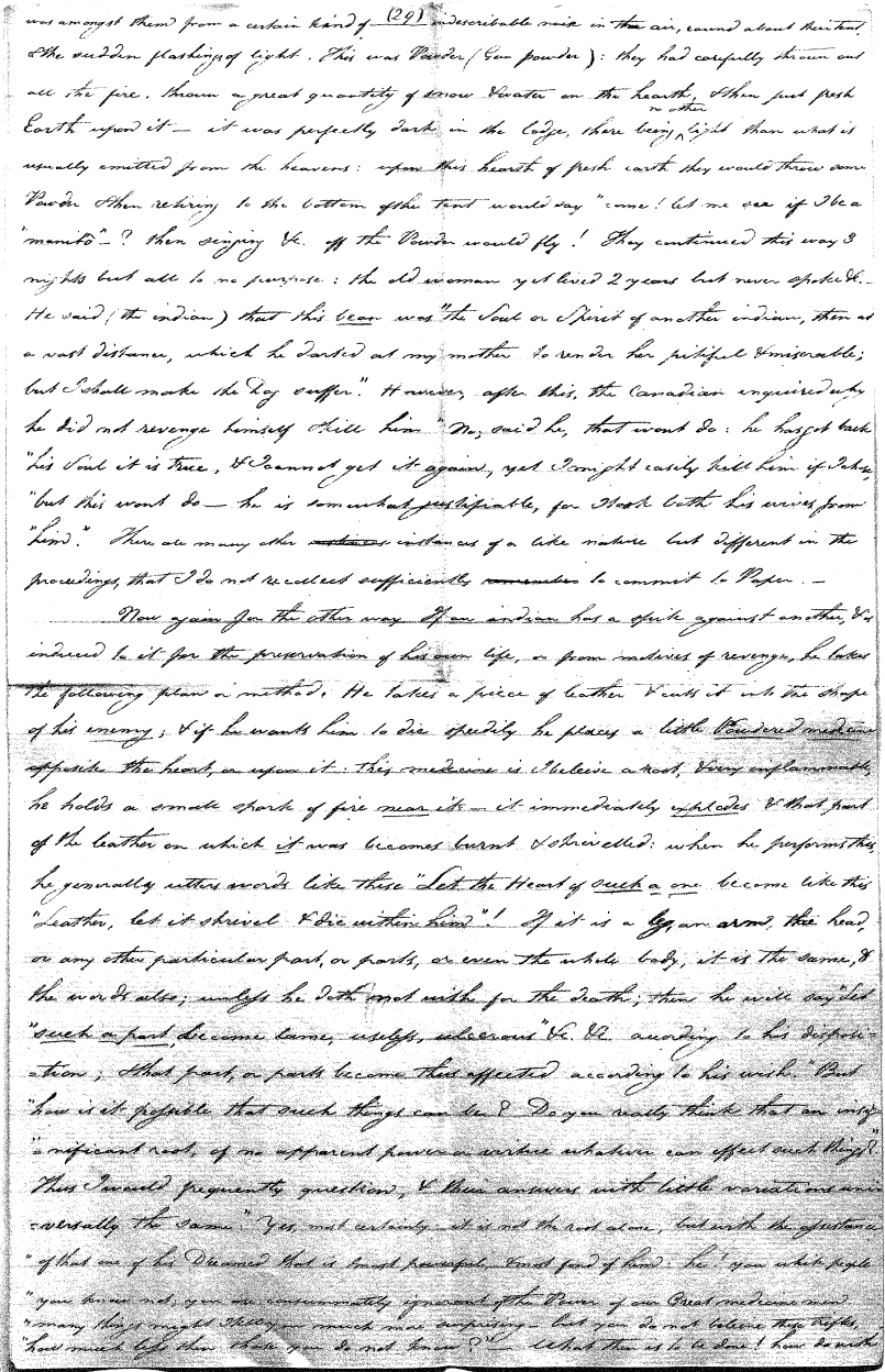 Enough of ye I say"; & frequently for the space of some minutes repeating the same, & now & then calling out "do not Thou enter." The Stone was the first one known to us, by his song; for every one almost that entered sang his song, to which those (the indians) on the outside would keep chorus. A vast number entered, I verily beleive upward of an hundred; for upwards of that number of times the frame shook back-&-forwards and very smartly as if to fall; & among the first were some truly terrible characters. I have almost entirely converted myself from these foolish ideas of Ghost & hobgoblins, but I assure you in truth that I more than once felt very uneasy. The Ice entered—he made a noise extremely resembling that made by a person shivering with cold, loud, & hoarse & liquid. The Devil himself also entered in propria persona, in a very authoritative & commanding manner: I assure you there was no laughing nor gigling outside, all the time he sang & spoke. The Turtle spoke as an old Jocular man. "I hate the french; for in their travels "when they find me, they kill me & eat me:—I shall answer none of their questions" but this was a joke; for he laughed. "Speake out Turtle, speake out, louder that "we hear the", said those without "—I would too, replied he, but my voice is "so strong I must contract it thus otherwise ye could not endure the sound "of it." "Hop! continued he, I must imitate the drunk", which he did to the great diversion of us all & concluded with snoring, the natural end of all drunken feasts & then became quiet, on which another voice (which I also perfectly heard & understood as well the Turtle herself) cried out--"see! see! if she does not look like a frog stretched out" & this raised a proper laugh both in & out. The Dog entered, & spoke perfectly plain & distinct, & with a more elegant & harmonious voice I ever heard in my life. Bears of 3 or 4 different sorts, the horse, moose, Skeletons, spirits of departed & still living friends entered; but none but the latter & above mentioned were to be understood by any but the conju- ror himself. On the entering of one "that is my (adopted) Son" said an Indian seated by me & called out his name to which he readily answered besides questions: this young man & a girl, both living, spoke very plain (you must observe that it is not their bodies, but their Souls or Spirits that enter)—Children almost at the instant of birth, Dwarfs, Giants; but this latter did make a noise indeed. We all laughed very heartily when the horse entered; for it appears he passed too near the Turtle who called out as the horse was flying about (in the inside) singing & rattling his rattler, "I wish you would take care of yourself & not tread
