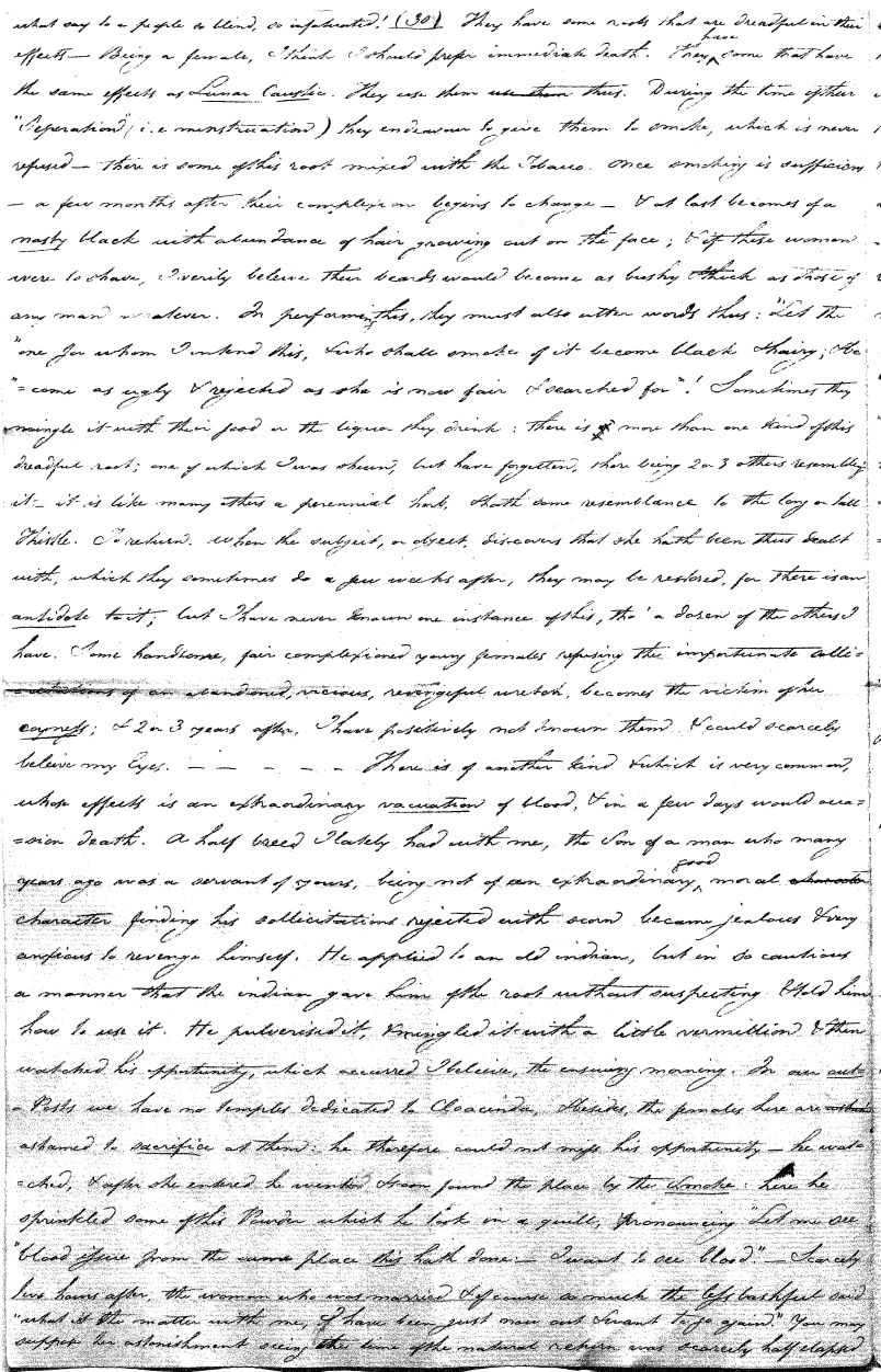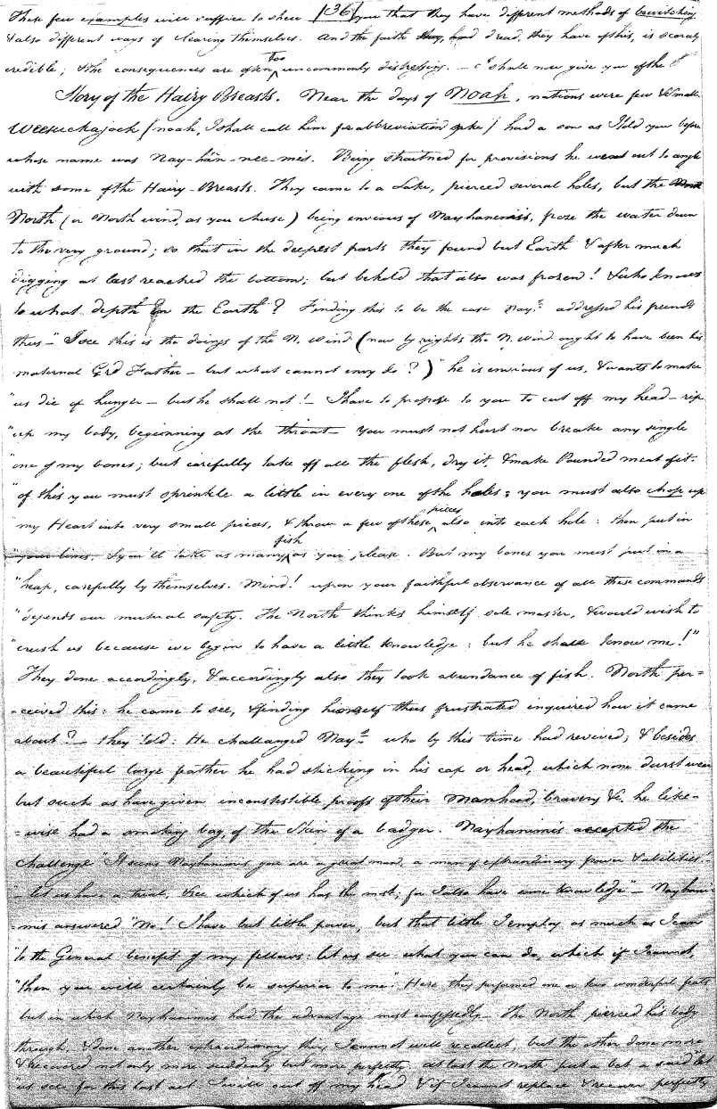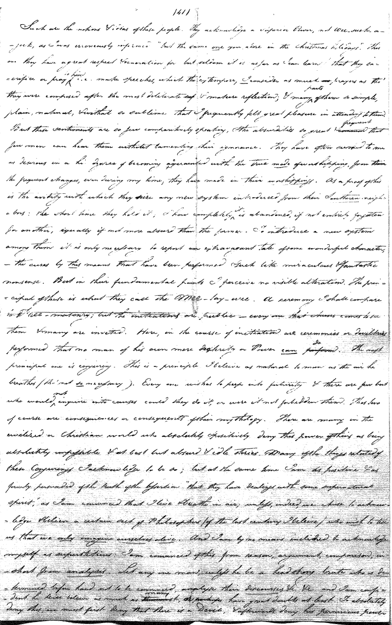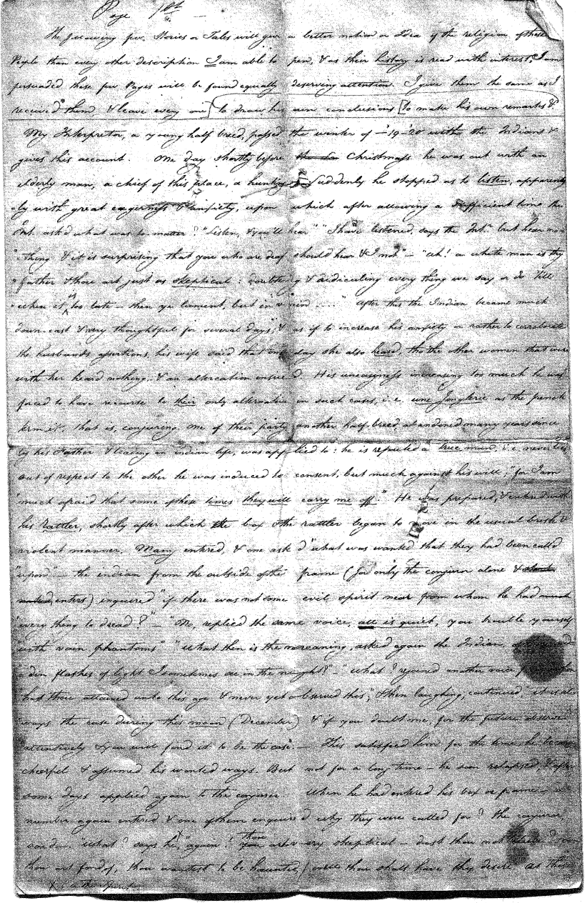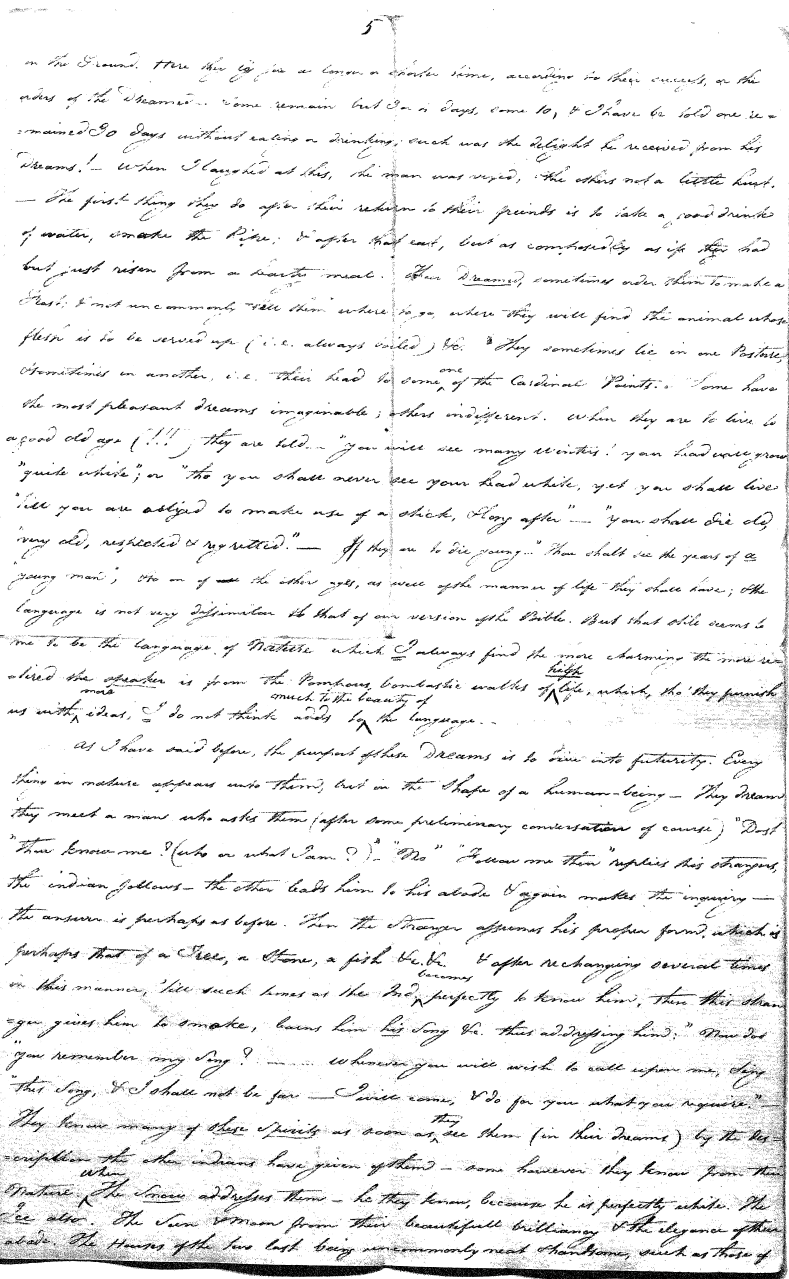 Enough of ye I say"; & frequently for the space of some minutes repeating the same, & now & then calling out "do not Thou enter." The Stone was the first one known to us, by his song; for every one almost that entered sang his song, to which those (the indians) on the outside would keep chorus. A vast number entered, I verily beleive upward of an hundred; for upwards of that number of times the frame shook back-&-forwards and very smartly as if to fall; & among the first were some truly terrible characters. I have almost entirely converted myself from these foolish ideas of Ghost & hobgoblins, but I assure you in truth that I more than once felt very uneasy. The Ice entered—he made a noise extremely resembling that made by a person shivering with cold, loud, & hoarse & liquid. The Devil himself also entered in propria persona, in a very authoritative & commanding manner: I assure you there was no laughing nor gigling outside, all the time he sang & spoke. The Turtle spoke as an old Jocular man. "I hate the french; for in their travels "when they find me, they kill me & eat me:—I shall answer none of their questions" but this was a joke; for he laughed. "Speake out Turtle, speake out, louder that "we hear the", said those without "—I would too, replied he, but my voice is "so strong I must contract it thus otherwise ye could not endure the sound "of it." "Hop! continued he, I must imitate the drunk", which he did to the great diversion of us all & concluded with snoring, the natural end of all drunken feasts & then became quiet, on which another voice (which I also perfectly heard & understood as well the Turtle herself) cried out--"see! see! if she does not look like a frog stretched out" & this raised a proper laugh both in & out. The Dog entered, & spoke perfectly plain & distinct, & with a more elegant & harmonious voice I ever heard in my life. Bears of 3 or 4 different sorts, the horse, moose, Skeletons, spirits of departed & still living friends entered; but none but the latter & above mentioned were to be understood by any but the conju- ror himself. On the entering of one "that is my (adopted) Son" said an Indian seated by me & called out his name to which he readily answered besides questions: this young man & a girl, both living, spoke very plain (you must observe that it is not their bodies, but their Souls or Spirits that enter)—Children almost at the instant of birth, Dwarfs, Giants; but this latter did make a noise indeed. We all laughed very heartily when the horse entered; for it appears he passed too near the Turtle who called out as the horse was flying about (in the inside) singing & rattling his rattler, "I wish you would take care of yourself & not tread