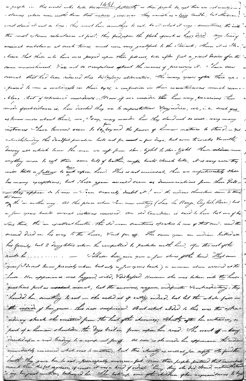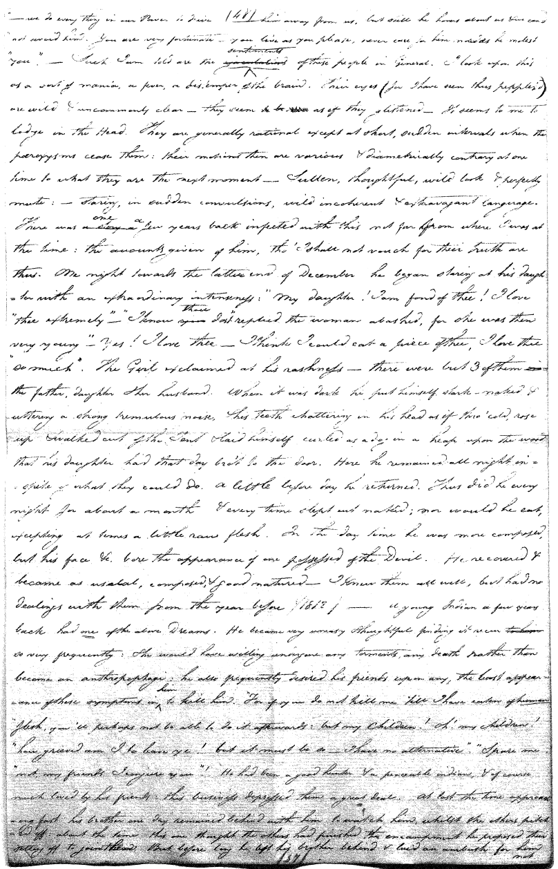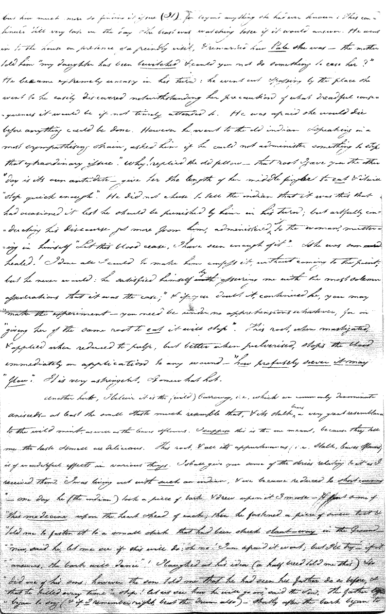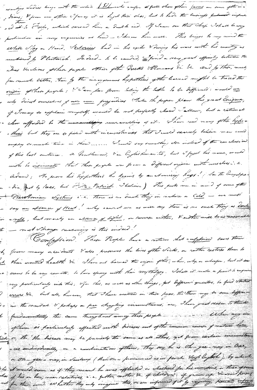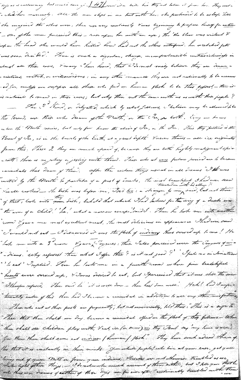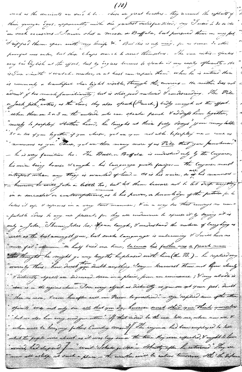 Enough of ye I say"; & frequently for the space of some minutes repeating the same, & now & then calling out "do not Thou enter." The Stone was the first one known to us, by his song; for every one almost that entered sang his song, to which those (the indians) on the outside would keep chorus. A vast number entered, I verily beleive upward of an hundred; for upwards of that number of times the frame shook back-&-forwards and very smartly as if to fall; & among the first were some truly terrible characters. I have almost entirely converted myself from these foolish ideas of Ghost & hobgoblins, but I assure you in truth that I more than once felt very uneasy. The Ice entered—he made a noise extremely resembling that made by a person shivering with cold, loud, & hoarse & liquid. The Devil himself also entered in propria persona, in a very authoritative & commanding manner: I assure you there was no laughing nor gigling outside, all the time he sang & spoke. The Turtle spoke as an old Jocular man. "I hate the french; for in their travels "when they find me, they kill me & eat me:—I shall answer none of their questions" but this was a joke; for he laughed. "Speake out Turtle, speake out, louder that "we hear the", said those without "—I would too, replied he, but my voice is "so strong I must contract it thus otherwise ye could not endure the sound "of it." "Hop! continued he, I must imitate the drunk", which he did to the great diversion of us all & concluded with snoring, the natural end of all drunken feasts & then became quiet, on which another voice (which I also perfectly heard & understood as well the Turtle herself) cried out--"see! see! if she does not look like a frog stretched out" & this raised a proper laugh both in & out. The Dog entered, & spoke perfectly plain & distinct, & with a more elegant & harmonious voice I ever heard in my life. Bears of 3 or 4 different sorts, the horse, moose, Skeletons, spirits of departed & still living friends entered; but none but the latter & above mentioned were to be understood by any but the conju- ror himself. On the entering of one "that is my (adopted) Son" said an Indian seated by me & called out his name to which he readily answered besides questions: this young man & a girl, both living, spoke very plain (you must observe that it is not their bodies, but their Souls or Spirits that enter)—Children almost at the instant of birth, Dwarfs, Giants; but this latter did make a noise indeed. We all laughed very heartily when the horse entered; for it appears he passed too near the Turtle who called out as the horse was flying about (in the inside) singing & rattling his rattler, "I wish you would take care of yourself & not tread