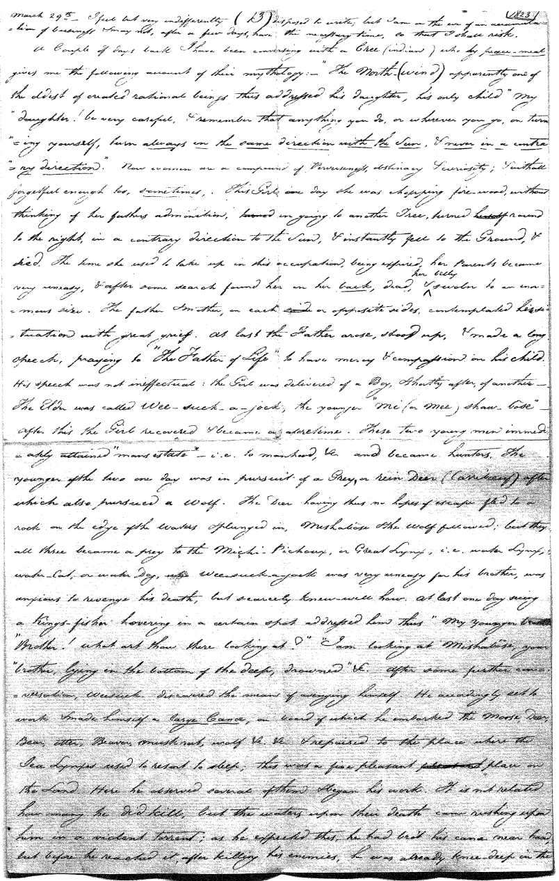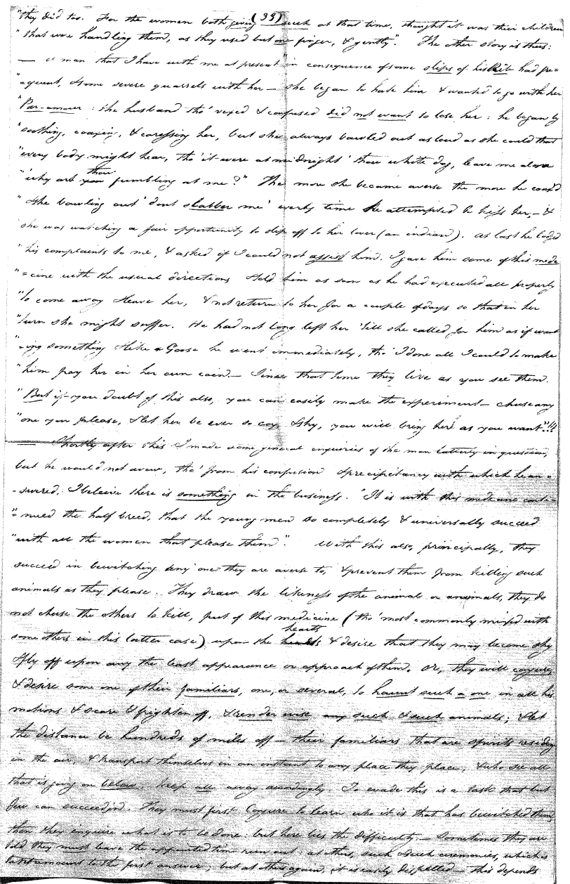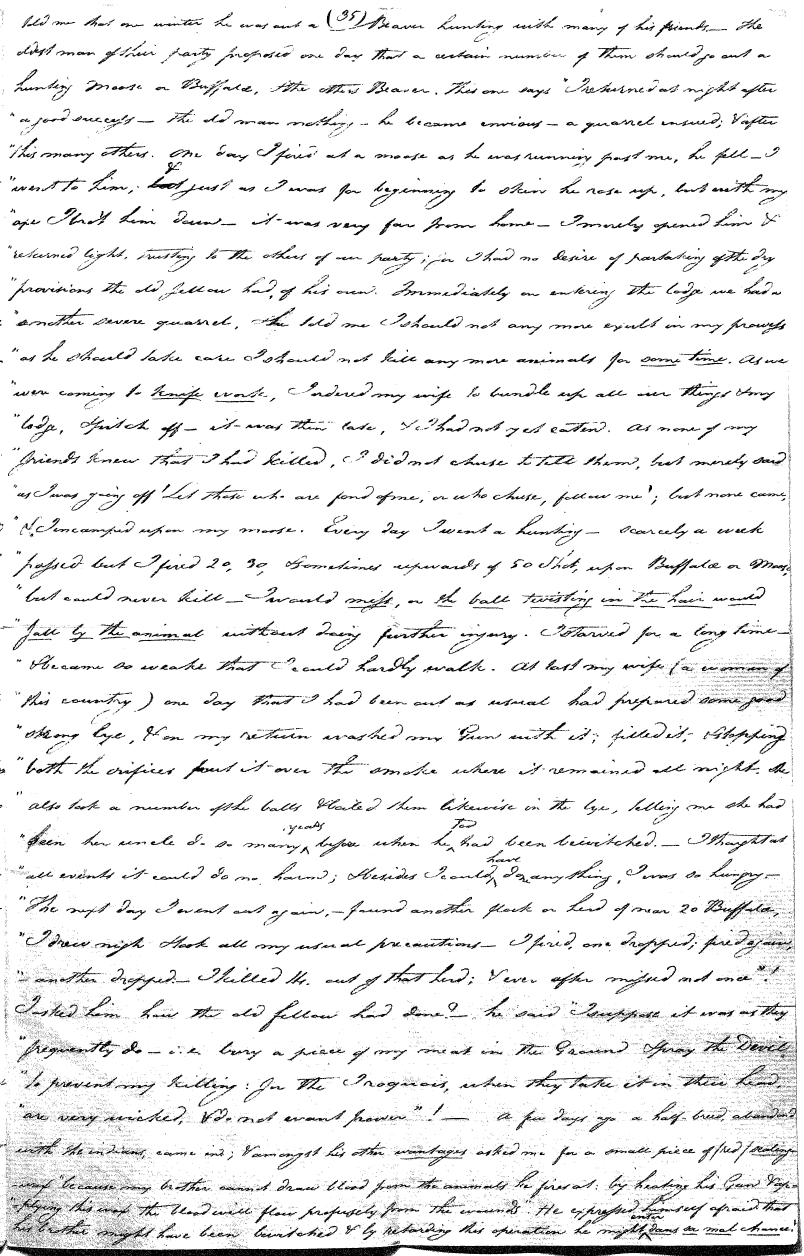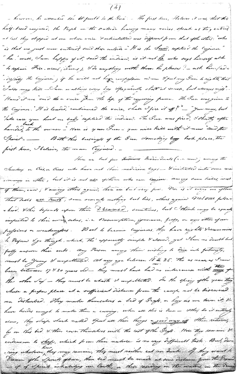 There are but few individuals (men) among the Sauteux or Cris or Crees who have not their medicine bags and [are not] initiated into some ceremony or other. But it is not all of them who can conjure. Among some tribes most of them can, and among others again there are but very few. Nor is it every one of them that tells all truth, some scarcely nothing but lies, others again Not One falsehood. And this depends upon their Dreamed, sometimes. But I think [it] may be equally imputed to their own selves, [to] presumption, ignorance, folly, or any other of our passions or weaknesses.