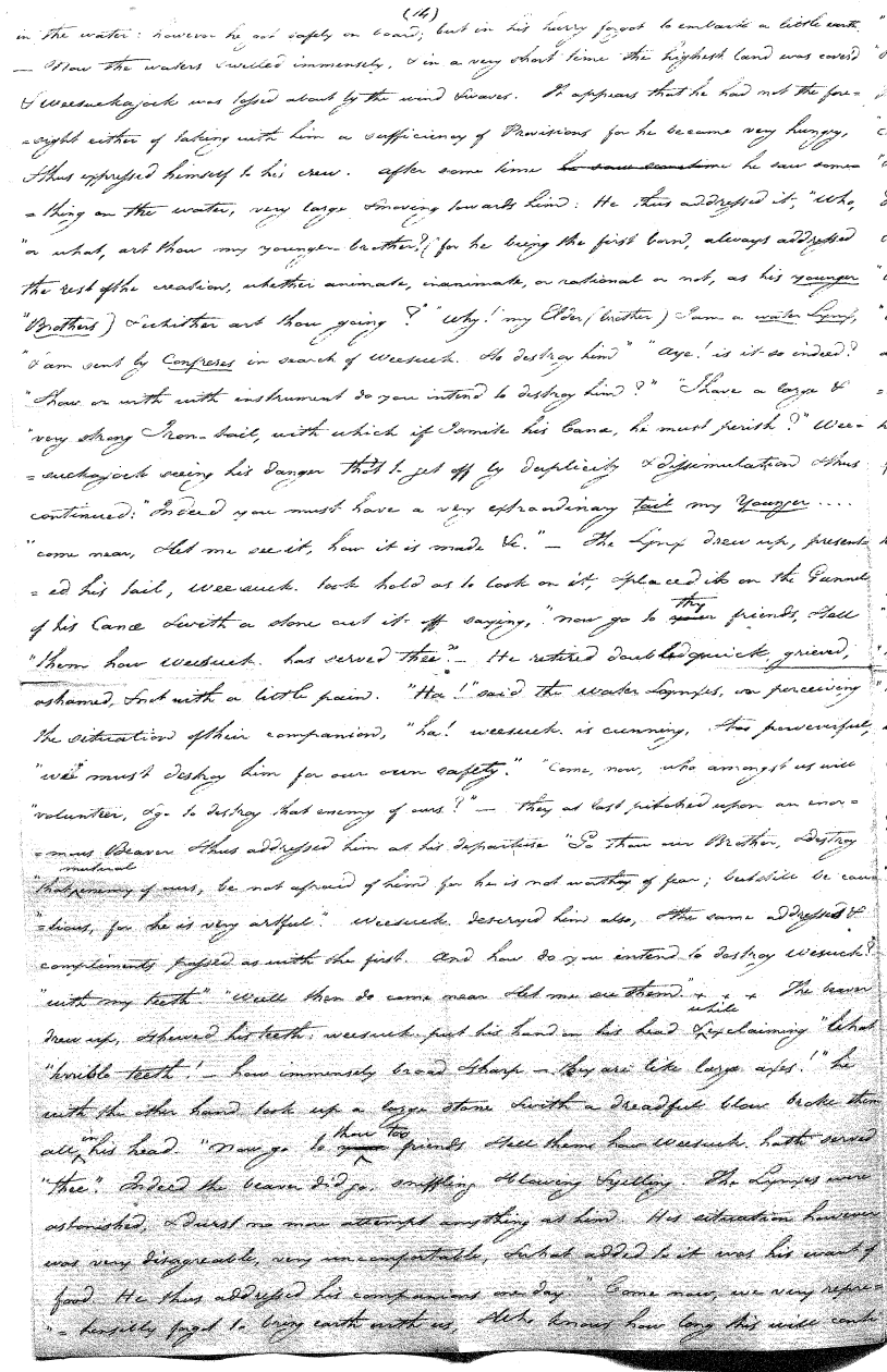 There is also the Sea Serpent, a monstrous animal and has much power. The Mermaid (or Sea-Man), the Water Lynx or rather Tyger—a dreadful character [is] this last, who keeps all the inhabitants of the deep in the greatest subjection. There are however one or two who contend with him, and sometimes he is reduced to the necessity of compounding with them—the Great Turtle, and many others. They have their abodes in the deep, but perfectly dry and comfortable. Each one of these, and indeed all of them, have their stories or mythology. Some I forget entirely and others remember too incorrectly to mention at present.