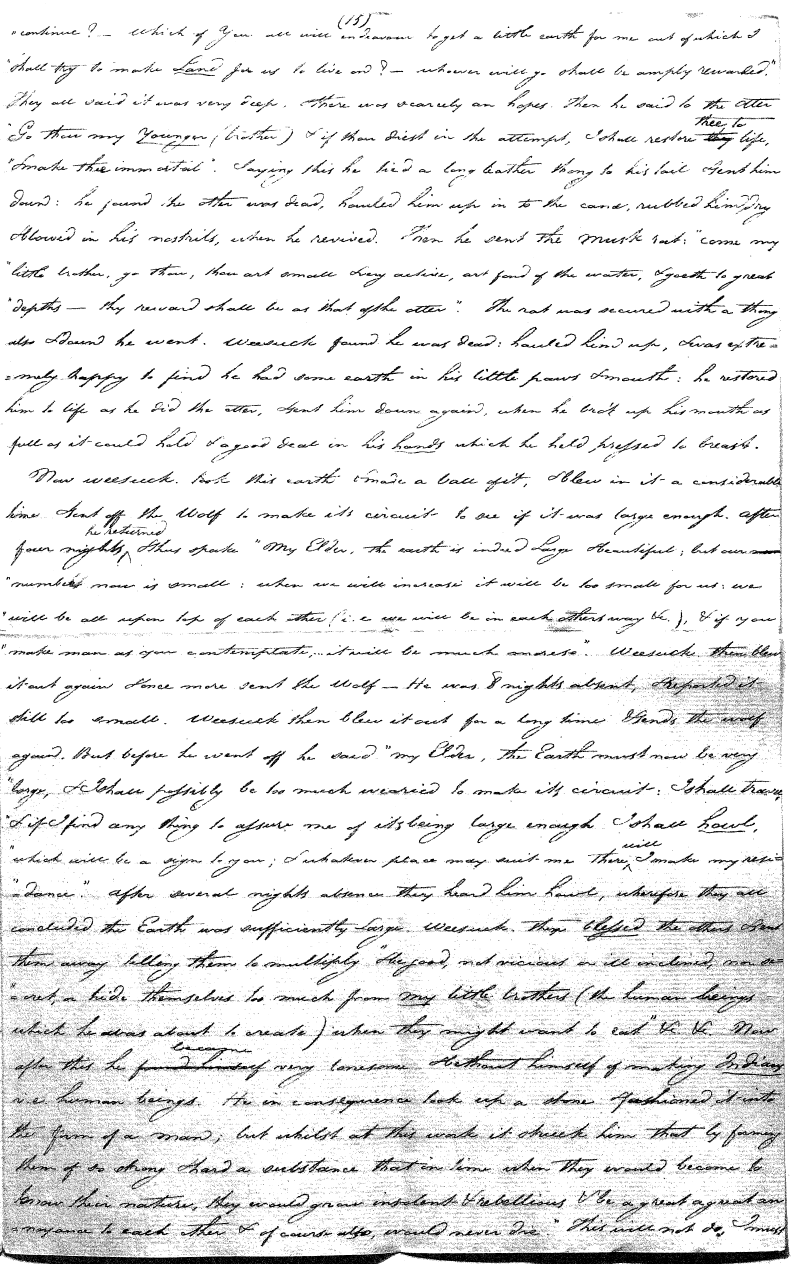 One principal amongst all these, and everything in nature appears at least to some of them, is the Supreme Being, whom they term Wee-suck-ā-jāāk (the last a's being pronounced as in 'all', 'hawk' etc.; the first as ale, bail etc.) i.e. by his proper name, his common name, Gey-Shay-mani-to (this is among the Crees nation), which signifies "the Greatly charitable Spirit." He is uncommonly good and kind, addresses them and talks to them as to children whom he most tenderly loves and is extremely anxious for.