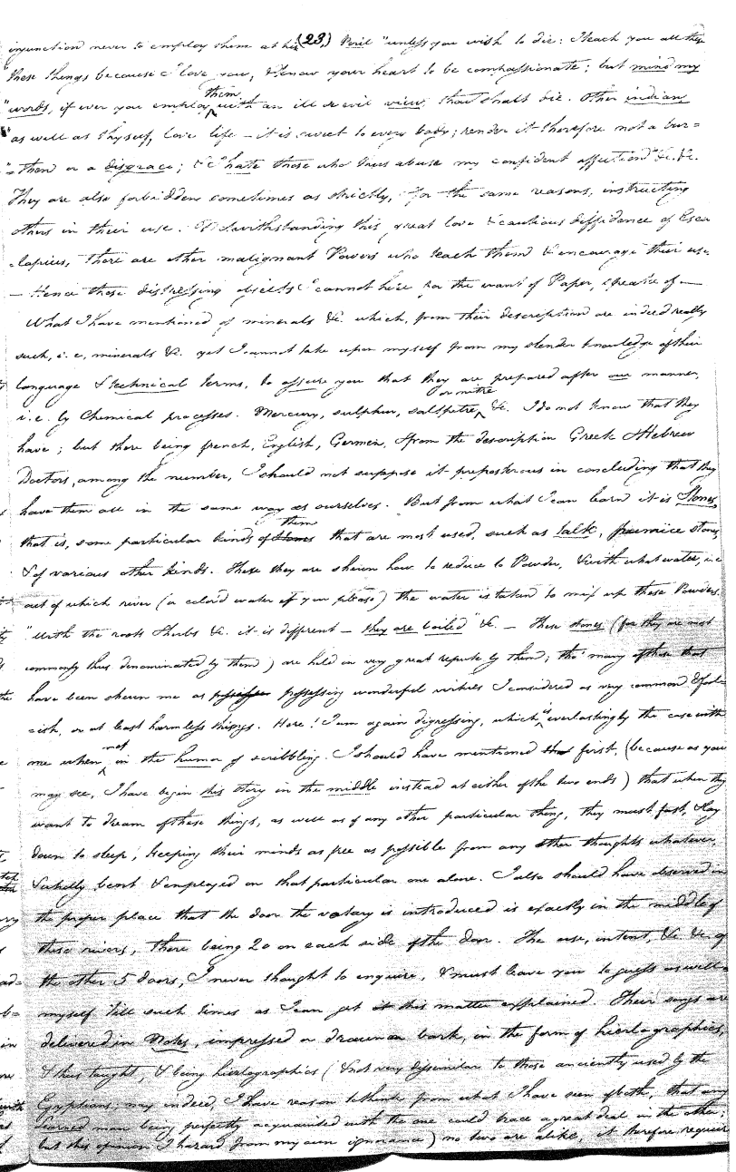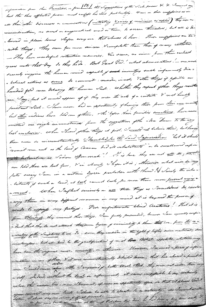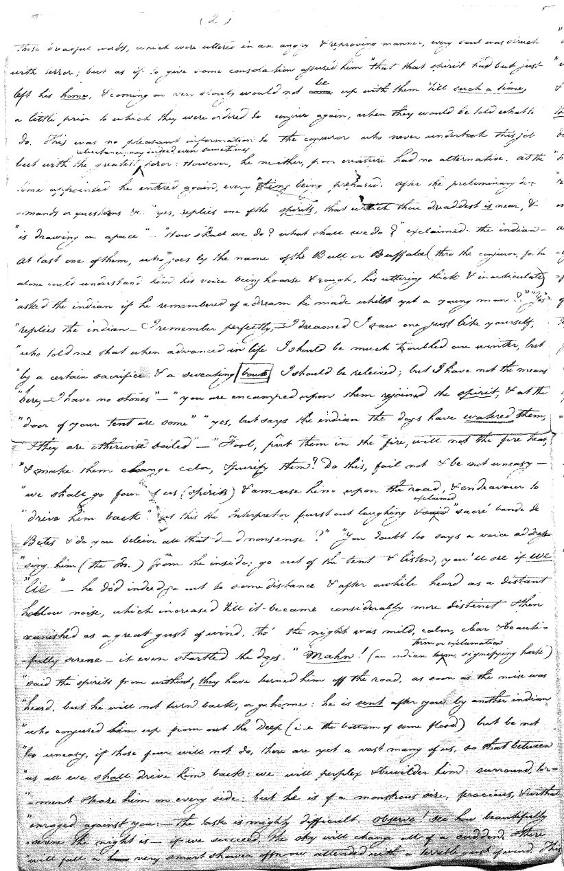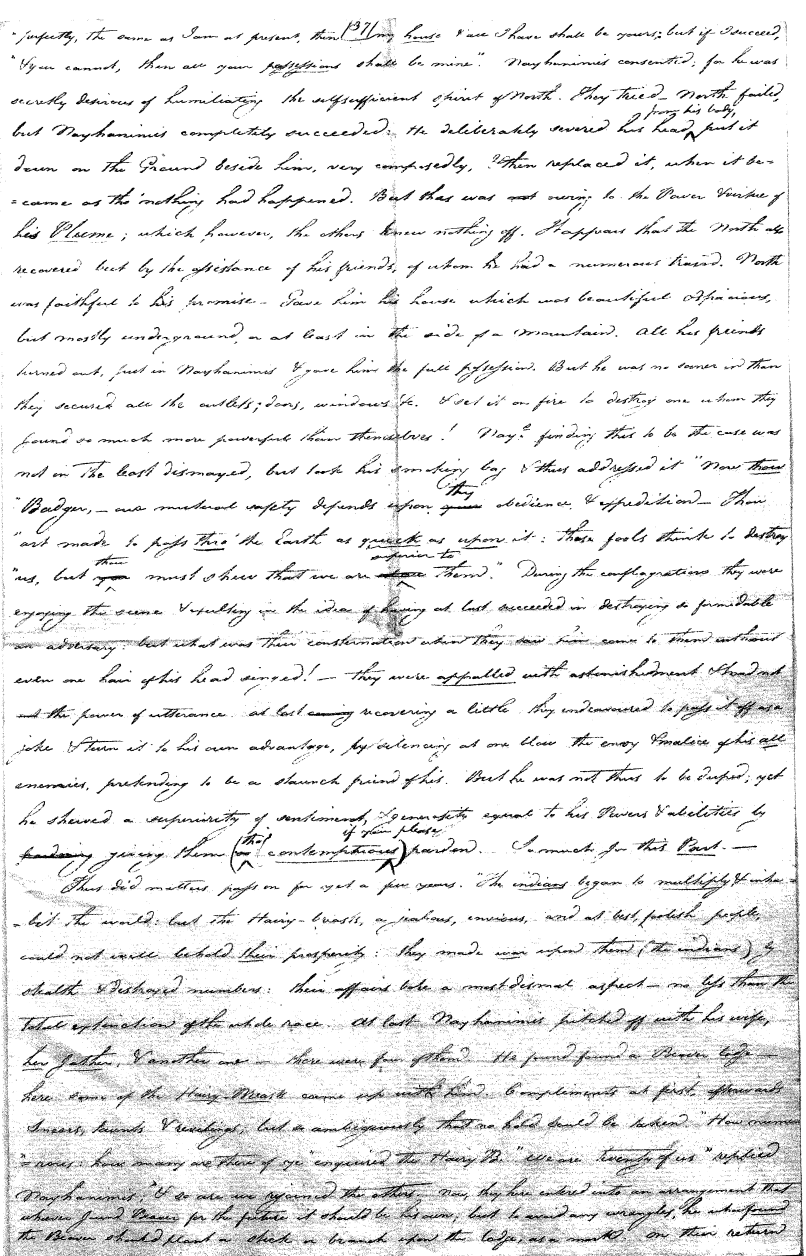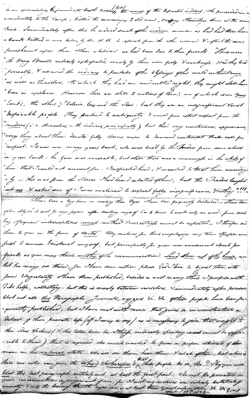 Thus far everything is very well, and is perhaps a better idea than many of the vulgar christians can give. But on the other hand again, their mythology, or stories relating to him, are many of them absurd and indecent in the highest degree, reducing him to the level of his creatures, and not unfrequently their making him dupe, but become so by such vile, such abominable deception as I doubt to be equalled by the most absurd and romantic of the Arabian tales. For there are many of these tales the author durst not publish for the obscenity and indecency. There are some obscene passages also in these tales (of the Indians) but not more than might be expected from a people yet in a perfect state of nature as to their mental powers, to our eternal shame and scandal. This one they love, they love him a great deal, and are by no means afraid of him, because he always addresses them "my little children" and all the rest of his character is of a piece with this.