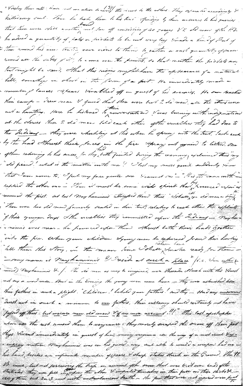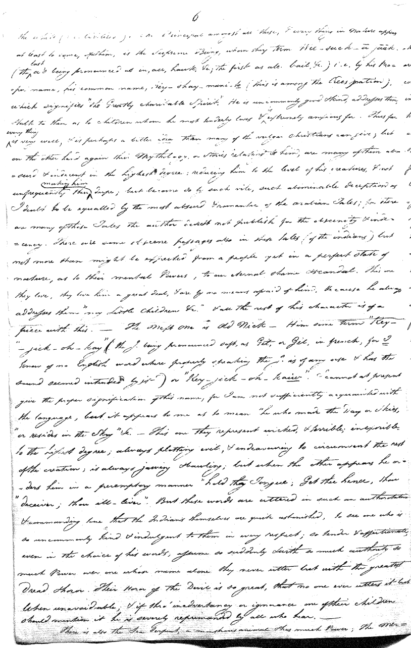The next one is Old Nick. Him some term "Key-jick-oh-kay" (The 'J' being pronounced soft, as Git or Gil, in French, for I know of no English word where properly speaking the J is of any use and has the sound seemed intended by it) or "Key-jick-oh-kaiw". I cannot at present give the proper signification of this name for I am not sufficiently acquainted with the language, but it appears to me as to mean "he who made the day or skies, or resides in the sky". This one they represent wicked, and terrible, inexorable to the highest degree, always plotting evil and endeavouring to circumvent the rest of the creation. [He] is always jawing and bawling. But when the other appears, he orders him in a peremptory manner. "Hold thy tongue. Get thee hence, thou deceiver; thou ill-liver." But these words are uttered in such an authoratative and commanding tone that the Indians themselves are quite astonished to see one who is so uncommonly kind and indulgent to them in every respect, so tender and affectionate, even in the choice of his words, assume so suddenly and with so much authority, so much power over one whose name alone they never utter but with the greatest dread and horror. Their horror of the Devil is so great, that no one ever utters [his name] but when unavoidable. And if, through inadvertency or ignorance, one of their children should mention it, he is severely reprimanded by all who hear.