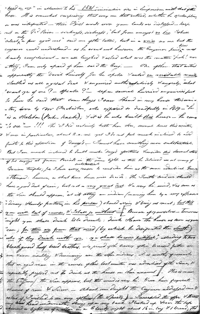 tho' dim, yet perfectly distinct. Tho' they all appear as lights, some larger & others smaller, this one was denominated the Fisher Star; the name by which they designate the Plough, I believe we call it, or Great Bear, from the supposed resemblance it bears to that animal, the fisher. When I was entering, several of the Indians on the outside called out to the Spirits "Gently! Gently! It is our Chief who wishes to see ye:—do "him no evil" &c.—I had my apprehensions. A little after one P.M. one of my men looked in, with several Indians, & saw several small lights about as large as the Thumb nail. A few minutes before 2 P.M. being day light they gave another shaking to the frame & made their exit. The above is an account of only a small part, for I am too much pressed for time—I cannot therefore enter into particulars, nor a larger detail; nor give you my opinion further than a few words. I am fully convinced, as much so as that I am in existance, that Spirits of some kind did really & virtually enter some truly terrific, but others again quite of a different character.— I cannot enter into a detail by comparisons from ancient & more modern history, but I found the consonance, analogy, resemblance, affinity, or whatever it may be termed so great, so conspicuous that I verily beleive I shall never forget the impressions of that evening; but above all things that sticks most forcibly in my mind is the unbound Gratitude we owe, & ought to shew, every instant of our existance to that almighty Power that deigned to sacrifice his only Son for us for our Salvation! Oh my God! let me never for- get this!—& teach me to thank thee not only with my lips but with every action of my life! x x x x x x x x &c. &c.— Here I must close & in a few minutes Seal up this for your peru- sal, sincerely wishing I may find an opportunity, safe, of conveying it to you—How earnestly I wish Robt had been present & understood the language—This would convince the most skeptic.— To Mr Wm Nolan, Wm Henry G. Nelson Note: Read these Pages among yourselves, & lend them not out of the house—