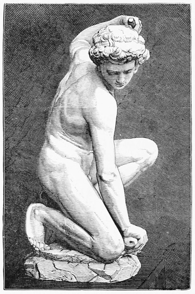 Dr. Burne Jones—for Oxford has bestowed on him its D.C.L., to its own honor as much as his—has decorated a grand piano with finest art. Around its bands is told the fable of Orpheus, the potency of music, in scenes of classical, but not conventional, treatment. On the lid is a Muse leaning from an oriel of the blue sky; beneath stands a poet musing; and between them is a scroll inscribed with a bit of old French, “N’oublié pas”—motto of the family for whom the piano was made. At another end of the lid is painted amid bay-leaves the page of a book, with illuminated letters here and there, the lines being those of one of Dante’s minor poems, beginning, “Fresca rosa novella.” But all these beauties are surpassed when the lid is lifted. Amid the strings, which are exposed, there is a drift of roses, as if blown into little heaps at the corners by the breath of music. On the interior surface is painted a picture to be gazed on with silent admiration, for few can be the strains from those keys which will interpret the subtle sense of the picture. The only name given is Terra Omniparens. Between the thorns and the roses sits this most beautiful Mother, naked and not ashamed, with many babes around her. Above, beneath, around, amid the foliations they are seen—impish, cherubic, some engaged in ingenuities of mischief, others in deeds of kindliness and love. Greed, avarice, cruelty, affection, prayer, and all the varieties of these are represented by these little faces and forms. Some nestle around the Mother; one has fallen asleep on her lap. The fair Mother is serene; she is impartial as the all-nourishing, patient Earth she typifies; all the discords turn to harmonies in her eternal generation. Her impartial love waits on the good and the evil; she is one with the art that “shares with great creating Nature.”