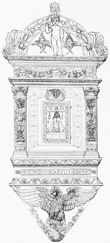 One residence particularly has connected itself in the course of my observations with the high place given, in this extract from Emerson’s chapter on Domestic Life, to the individuality so essential to a home, and so difficult to obtain. Those who have found delight—as who has not?—in the paintings which the American artist, Mr. George S. Boughton, A.R.A., has given to the world will not be surprised to learn that he has built up around him a home worthy of his refined taste and his delicate perception of those laws of beauty which enable it to harmonize with individual feeling without ever running into eccentricity. Boughton was one of the first to make his home harmonious with his art, and before he built West House, his present residence, he made the interior of an ordinary house, Grove Lodge, Kensington, into a residence as unique as one of those charming pictures of his which so tenderly invest the human life of to-day with the sentiment and romance of its own history. Passing once through that hall, touched everywhere with the toned light of antique beauty, to his studio, the picture just finished for the Royal Academy appeared as a natural growth out of the aesthetic atmosphere by which he was surrounded—some girls of Chaucer’s time beside an old well and a cross, filling the water-bottles of pilgrims on their way, amid the spring blossoms, to the shrine of St. Thomas à Becket, “the holy, blissful martyr,” at Canterbury. The embowered English landscape closed as kindly around the figures and costumes and symbols of the olden time as they do now about the features of a new age; and no less harmoniously did the ornaments and decorations of that home surround the cultured society which the young host and hostess gather to their assemblies. Although Grove Lodge is no longer the home of the Boughtons, its decorations were so instructive as well as beautiful, that I insert here an account of them.