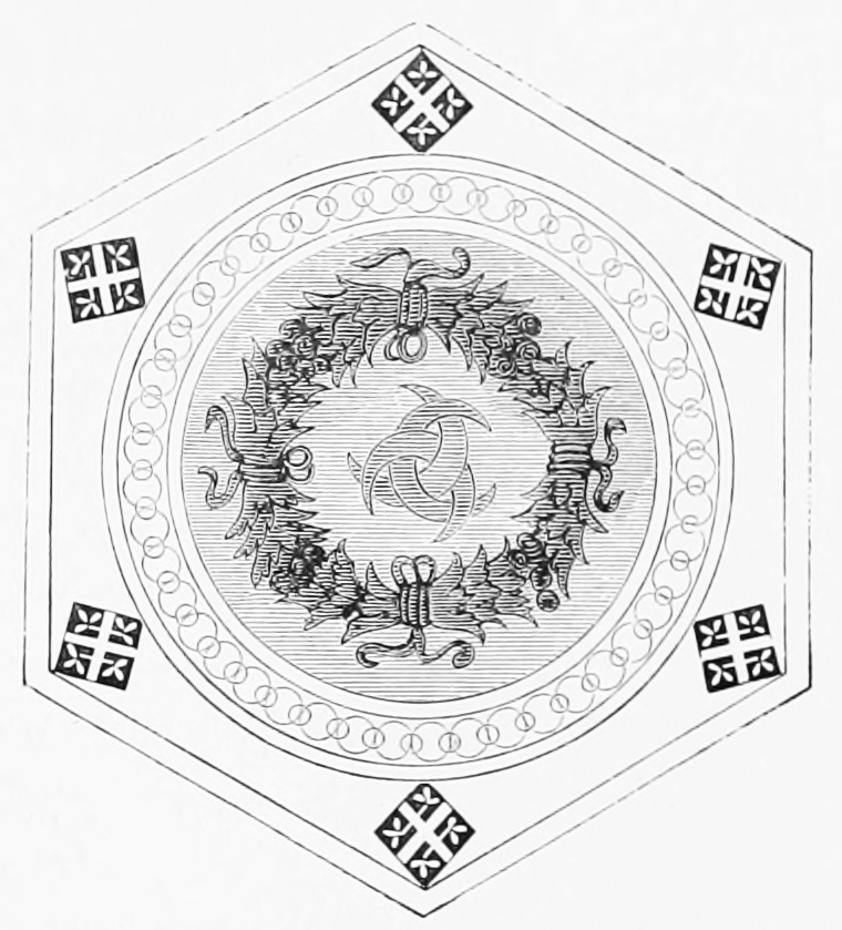 This dining-room is lighted by a large window set back in a deep recess, curtained off from the main room with hangings of red velvet, and exquisitely environed by original designs. The window is composed of the richest quarries, holding in their centres each its different decorative flower or other natural form, and these being collectively the frame of large medallions of stained glass, representing Van Eyck, Van Orley, and the burgomaster’s wife, from Van Eyck’s picture in the National Gallery.