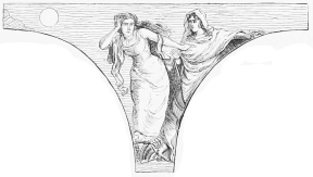 Throughout this beautiful house there are little arrangements for convenience, always attended by beauty, which are altogether indescribable—a head or a sprig of ivy painted in some panel, or a little gauze curtain draping a casual opening. But I must particularly note in the drawing-room a beautiful capping to the dado. It is a white moulding of the Elgin marble reliefs, and most beautifully fringes the dark-figured stuff of the dado. I have already described the fine drapery of this room. I need only now say that Mr. Alma Tadema has designed some candelabra which appear to me most beautiful. The reader will, I fear, be but little able to obtain from one of the drawings an idea of the rich minglings of the bronze with the rose porcelain egg-shaped centre-piece, and the figures painted upon it. Both of the candelabra which I have selected as specimens are for rose-colored candles. In the houses of many artists ancient oratory (suspended) candelabra are used for the centres of rooms, and also brass repoussé sconces bracketed with bevelled mirrors. The English upper classes have never been reconciled to the use of gasaliers in their drawing-rooms, and the artists have pretty generally opposed the use of gas, which is believed to be damaging to oil-pictures.