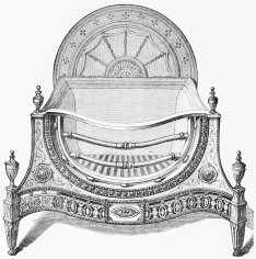 In all the houses which are carefully decorated in London great use is made of tiles. The tiles which are unrivalled in the esteem of artists are the old Dutch, which consequently have been nearly all bought up. A single old Dutch tile, which when made hardly cost more than a sixpence, now finds eager purchasers at a pound. It is a singular fact that our manufacturers can imitate Persian and Egyptian tiles, but have still to send to Holland to get anything resembling the old Dutch, and even there they can obtain but an approach to the rich coloring and quaint designs of old times. Mr. Stevenson, the architect whose book has been referred to on a previous page, obtained a large number of these old tiles, which when put together formed large pictures; but several of them were wanting, and he had to make designs of what those he possessed appeared to imply were on the others. He had tiles made which, at any rate, completed the pictures; and though the new ones were carefully made, they may be easily picked out from the old. These tile pictures have been placed by Mr. Stevenson on the side of a sheltered entrance that leads from the street across the front-yard to his beautiful residence in Bayswater. Inside of this house there are many beautiful things, but it is chiefly remarkable for the admirable mantel-pieces on the ground-floor and that above it—in the hall common to both—which show rich old carvings set with tiles, chiefly Persian and Dutch, which are built from floor to ceiling. In the children’s school-room there is a chimney-piece covered with Dutch tiles representing most quaintly all the most notable scenes in the Bible, which must be a source of endless amusement to the little ones. The finest designs for tiles which I have seen in London are those of Messrs. Morris & Co., whose pictures, however, are often so beautiful that one dislikes to see them ornamenting fireplaces. Nevertheless, the grate and its arrangements are becoming matters of serious importance in every room, and a walk through the establishment of Messrs. Boyd, in Oxford Street, will show that the “warming engineers” have not been behindhand in providing stoves, tiles, and grates that may be adapted to many varieties of decoration. These gentlemen tell me that they are continually on the watch to get hold of old grates, fenders, fire-dogs, and so forth, that were made a hundred years ago, on account of the great demand for them, and that they reproduce them continually; nevertheless they believe that they can produce a prettier grate now than could have been made in the last century. The engraving on page 198 represents a grate found in an English mansion about one hundred years ago. The one on this page represents a grate recently made for the late Baron Rothschild. The one on page 200 represents a grate and fireplace designed and made by Messrs. Boyd, which appears to me one of the most beautiful I have yet seen.