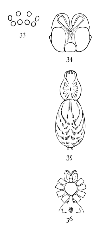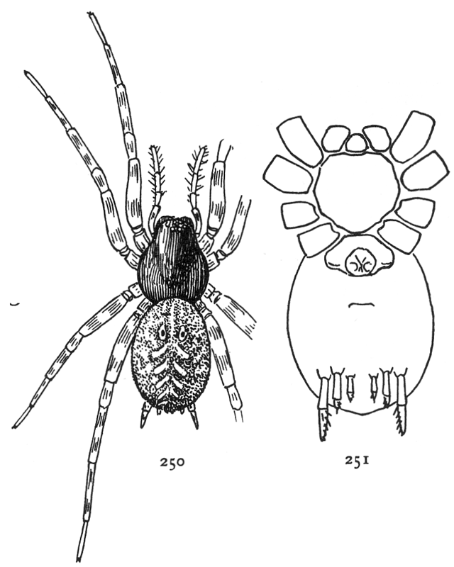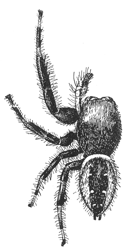 In the following pages a general description is given of each family, followed by descriptions of the species belonging to it, with a figure of each species placed as near as possible to the description. In some cases, where the genera are large and well defined, separate descriptions are given of each genus, but where the genus is not easy to distinguish or represented by only a few species, there is no separate generic description, and the species are placed next to those of other genera to which they are most closely related. If the names of spiders are known, they can readily be found by the index at the end of the book. If information is sought about an unknown spider, the illustrations through the book furnish the most convenient index, as the general form and proportions of spiders and the arrangement of their eyes usually show to what family they belong. The ground spiders and those without cobwebs are described first, and the sedentary species living in webs in the last half of the book. Readers unfamiliar with the subject are advised to read first the descriptions of the families and compare with them the spiders that they find in their own neighborhoods. The figures are in most cases enlarged for the sake of distinctness, and spiders of much smaller size must be looked for.