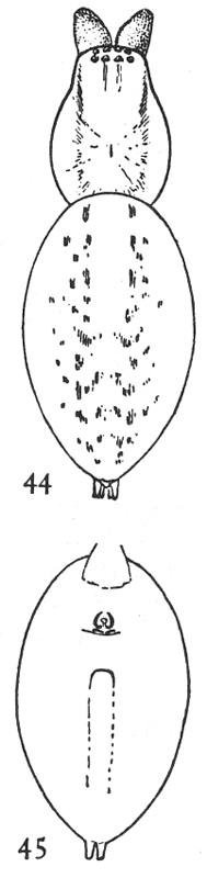The Drassidæ, like the Lycosidæ (p. 67), are ground spiders, though some genera, like Anyphæna (p. 12) and Clubiona (p. 15), are equally common in summer on bushes. They make nests in the form of a bag or flattened tube, but no cobwebs for catching insects, and are commonly found running about among dead leaves and short grass and sometimes even on bare ground and sand. In form they are usually two or three times as long as they are wide, like the Lycosidæ (p. 67), but more often flattened on the back. The legs differ but little in length, and the first and second pairs are directed forward, the third and fourth backward. Their hairs and spines are short, giving them a smooth, velvet-like appearance. The feet have two claws, with a brush of flattened hairs under them, like the Thomisidæ and Attidæ (p. 41), but unlike the Lycosidæ (p. 67), which have three claws. The mandibles are large and strong and are together as wide as the head. The eyes are all about the same size and arranged in two rows of about the same length and not far apart, but between different species there are slight differences in their arrangement. The colors are usually dull gray, brown, and black, with few markings or none. A few species are very brightly marked, as in Micaria (p. 9) and Pœilochroa (p. 4).