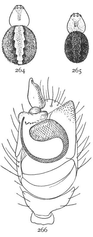 Dictyna volucripes and muraria.—These two gray spiders are the common Dictynas on walls and fences and on the ends of grass and weeds, where they make webs shaped according to the places where they[Pg 211] live, having in some part of the web a hole in which the spider usually hides (fig. 473). Some allied species make nearly circular webs on walls, with the hole near the center, and gather so much dust as to appear like a spot of dirt (fig. 471). Volucripes is about a sixth of an inch in length, and muraria an eighth of an inch. Volucripes is browner in color and more common on plants, and muraria is grayer and more common on fences. Both species are marked much alike. The cephalothorax is dark brown, partly covered with light gray hairs, some of which form roughly three stripes on the head. The abdomen is large and round, in some females nearly as wide as long. The front half has a middle dark spot of various shapes, and the hinder half two rows of spots connected in pairs with a middle line, forming a figure much like the markings of several species of Epeira (figs. 484, 487). The legs are dark gray or brown, covered with fine hairs, the first pair not much longer[Pg 212] than the body. In the females the mandibles are a little thickened in the middle. In the male they are elongated and turned forward at the ends and curved apart in the middle, and have a small tooth on the front near the base. The palpi of the males (figs. 485, 486) are short, with the patella as wide as it is long and wider than the femur and tibia. The tarsus is half longer than wide and pointed at the end. In the tibia there is a little difference between the species that can be seen by looking at the palpi from the side; in volucripes there is a stout process[Pg 213] at the base as long as the tibia itself and pointing upward at a right angle with it (fig. 485); in muraria the corresponding process is short and turned forward, and the tibia seems proportionally longer (fig. 486). The cribellum in both these species is large and can easily be seen in front of the other spinnerets. The calamistrum extends over half the length of the fourth metatarsus, which in volucripes is slightly curved.