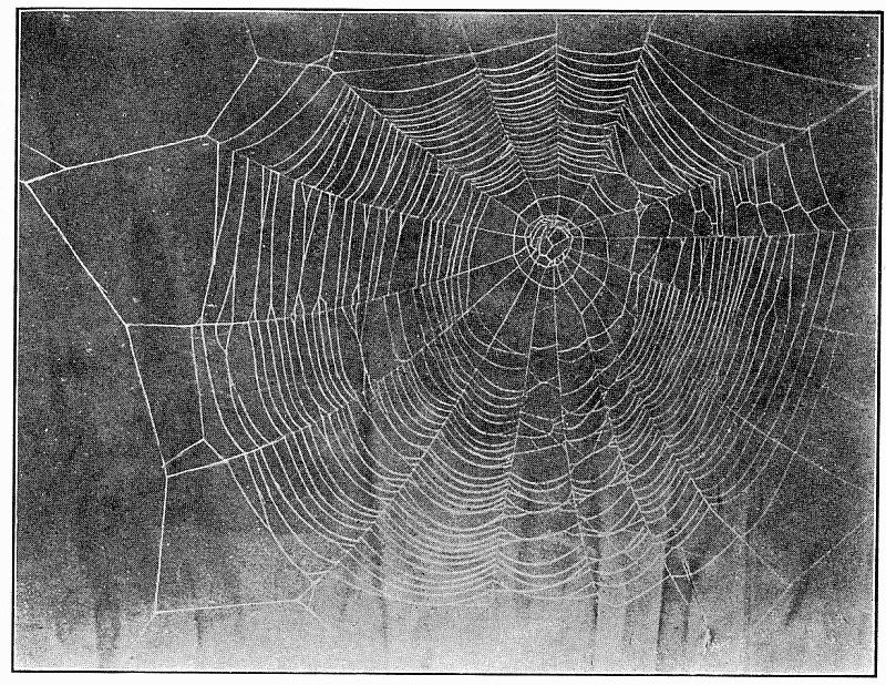 1. The flat webs, closely woven of long threads crossed by finer ones in all directions and connected with a tubular nest where the spider hides, and from which it runs out on the upper side of the web after insects that may fall upon it. These are made by Agalena and Tegenaria (pp. 91 to 104).