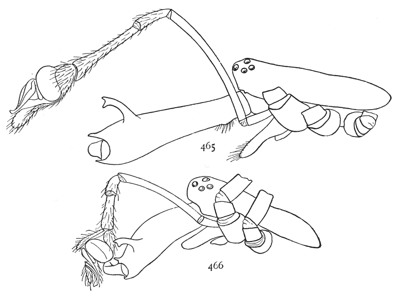 Tetragnatha straminea.—A quarter to three-eighths of an inch long, about the same size as laboriosa, and the same color. The legs, palpi, and mandibles are all a little longer than in laboriosa, and the lateral eyes are farther apart than the middle pairs (fig. 464). In the males the abdomen is shorter and smaller, and the legs longer. The male palpi (fig. 468) are one and a half times the length of the cephalothorax. In females the abdomen is usually three times as long as the cephalothorax and more slender than in laboriosa.