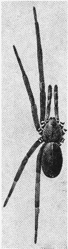 Filistata hibernalis.—One of the most common house spiders in the southern states, making webs in corners and on walls and fences (fig. 501). The body is about half an inch long, but the legs are so long and stout that it appears much larger. The first leg, which is the longest, is about twice the length of the body. The palpi are as long as the cephalothorax and thicker than in most spiders. The maxillæ are inclined toward each other so that they meet in front of the labium. The cephalothorax is flat and narrowed in front between the palpi, and the mandibles are small. The eyes are in one group, close together. The color is dark gray, without any markings, and the whole body is covered with fine short hairs. The calamistrum is very short, and near the base of the fourth metatarsus, where it can easily be seen. The web is like that of Dictyna, radiating irregularly from the spider's hiding place, and when this is on a flat wall forms sometimes a circle a foot or more in diameter, which becomes filled with dust and is enlarged and thickened as the spider grows.