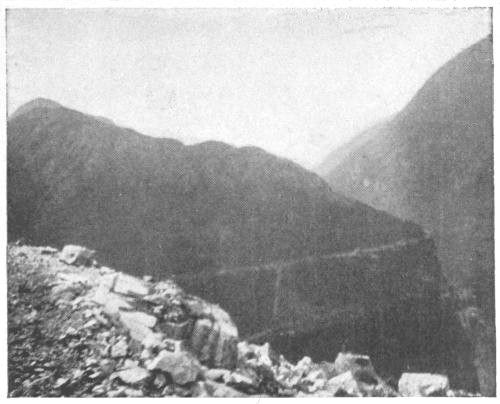 After leaving Glenwood Springs we wound up the gorge of the Grand River, the castellated, crenelated, serrated, scarped and wind-worn cliffs towering many thousand feet into the blue sky. The valley narrowed sensibly and the sheer heights imposed themselves more and more upon us as we approached the tunnel at the height of land 10,200 feet above the sea, and where part the waters of the Gulf of Mexico from those of the Pacific. On the Canadian Pacific Railway, the interoceanic divide between the waters of Hudson Bay and the Pacific is only some 5,300 feet above tide level, so now we were nearly a mile higher in the air. Yet the long journey of 2,000 miles from San Francisco, the crossing of the Sierra Nevada and Wasatch ranges, had brought us to this final ascent almost unperceived.