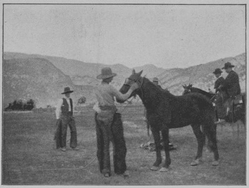 The crowd stuck to the sidewalk and seemed expectant. We did not know just what was going to happen, but stuck to the sidewalk, too, and well for us it was that we did so. There were rumors of a parade. A number of ranch maidens, riding restive bronchos, some sitting gracefully astride, drew their horses to one side. The crowd was silent. We were silent, too. Just then a cloud of dust and a clatter of hoofs came swirling and echoing down the street. A troop of horses! They were running like mad. They were bridleless, riderless; they were wild horses escaped. They ran like things possessed. No, not all were riderless, for behind them, urged by silent riders, each man with swinging lasso, came as many cowboys hot on the chase. Had the wild horses broken loose? Could they ever be headed off? We wondered. Was the fun for the day all vanished by the accident? Not so, we found. This was part of the game. Every broncho buster, if he would take part in the tests of ridership, must first catch a wild horse, that later an opponent should master. And the way those lassos swung and reached and dropped over the fleeing bronchos was in itself a sight worth stopping to see. Then, as each rider came out of the dust and distance leading the wild-eyed, terrified beast by his unerring lasso, great was the acclaim given him by the hitherto silent multitude. Every loose horse was caught before he had run half a mile, and thus haltered—the lariat around the neck—was led to the corral near the big meadow, where the man who should ride most perfectly would win the longed-for prize—a champion’s belt and a purse of gold.
