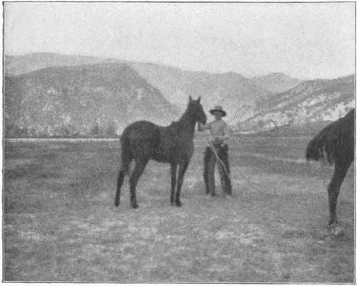 The Thompson boys each covered themselves with glory. Dick’s first horse was tamed so quickly—a big, bright bay—that they brought him a second one to ride again—a long, lean, dun-colored, Roman-nosed cayuse, with scant mane and tail. A mean beast, the sort of a horse that other horses in the bunch scorn to keep company with and hate with natural good horse sense. He stood very quiet through bridling, hoodwinking and saddling. He had seen the others in the game. His mind was quite made up. And when Dick vaulted into the saddle, he at first stood stock still, and then, as I set my kodak, I could see nothing but one great cloud of dun-colored dust and Thompson’s head floating in the upper levels of the haze. The horse was whirling and bucking all at the same instant, a hump-buck, a flat buck, an iron-legged buck, a touch-ground-with-belly buck, and a swirling-whirl and tail-and-neck twist at one and the same moment. Enough to throw a tender seat a hundred feet and crack his bones like pipe stems. And then, like the flight of an arrow from a bow, that dun-colored devil bolted straight for the wickedest edge of the fence. I thought Dick would be killed certain, but there he sat and drew that horse down on its hams three feet from sure death. It was a long battle, vicious, mean, fierce, merciless—the beast was bleeding, welts stood out on flanks and shoulders, its dry, spare muscles trembled like leaves shaken by wind.