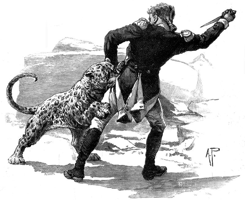 "Well!" he said to himself, "she must have taken a fancy to me. Perhaps she has never yet met anyone. It is flattering to be her first love!" At this moment the Frenchman fell into a shifting quicksand, so dangerous to the traveller in the desert, escape from which is hopeless. He felt that he was sinking; he gave a cry of terror. The panther seized him by the collar with her teeth, and springing backwards with stupendous vigour drew him from the gulf as if by magic.