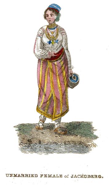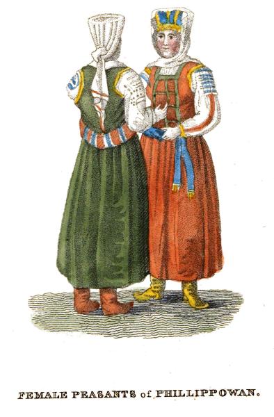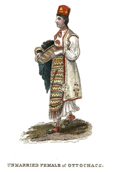 The annexed plate represents an unmarried female of Ottochacz. She wears a long open jacket without sleeves, neatly embroidered on the edges, and her hair, carefully plaited in tresses, is covered with a cap of red cloth. The apron universally exhibits a variety of gay colours. Married women are distinguished from virgins by wearing one of these aprons behind as well as before, and a large cloth resembling a mantle over the head and shoulders.
