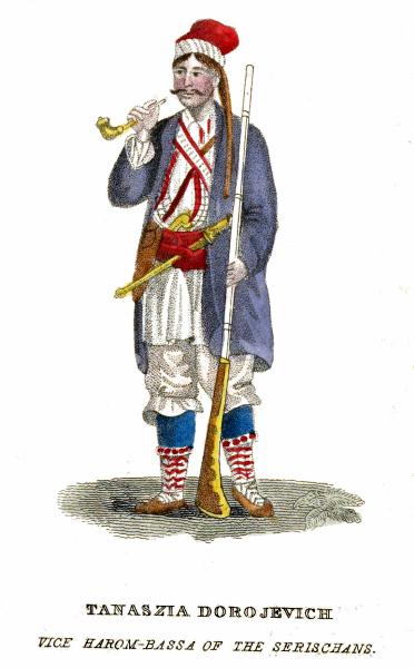 The chief of these Szeressans is styled Haram-Bassa. When fully equipped, he wears a sort of red uniform coat and waistcoat, blue pantaloons, and a sharp-pointed cap of green cloth, turned up with a red and white striped stuff. His arms consist of a musquet, with which he hits his man with never failing certainty at the distance of three hundred paces, a pair of pistols for nearer objects, a Turkish knife and a sword for close quarters; and on busy days there is none of these weapons perhaps but what he employs. In bad weather a wide red mantle with a hood covers both his person and his arms.