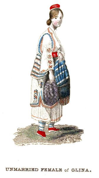 In the annexed representation of a young female of Glina, we again observe the red cap, but of a different form from that shown in the last engraving. In this instance it merely covers the crown of the head, the hair of which is tressed on each side and turned up behind. The tresses are frequently adorned with shells, metal rings, and other trinkets, and the costume in general resembles in cut and fashion that of the upper frontiers.