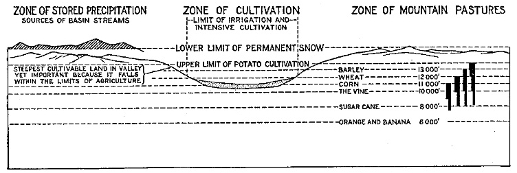 [9] Reference to the figures in this chapter will show great variation in the level of the timber line depending upon insolation as controlled by slope exposure and upon moisture directly as controlled largely by exposure to winds. In some places these controls counteract each other; in other places they promote each other’s effects. The topographic and climatic cross-sections and regional diagrams elsewhere in this book also emphasize the patchiness of much of the woodland and scrub, some noteworthy examples occurring in the chapter on the Eastern Andes. Two of the most remarkable cases are the patch of woodland at 14,500 feet (4,420 m.) just under the hanging glacier of Soiroccocha, and the other the quenigo scrub on the lava plateau above Chuquibamba at 13,000 feet (3,960 m.). The strong compression of climatic zones in the Urubamba Valley below Santa Ana brings into sharp contrast the grassy ridge slopes facing the sun and the forested slopes that have a high proportion of shade. 54 represents the general distribution but the details are far more complicated. See also Figs. 53A and 53B. (See Coropuna Quadrangle.)
