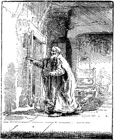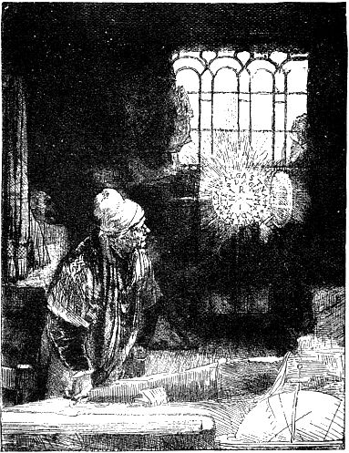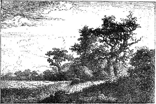 The artist who makes use of this method has to scoop no laborious furrows. He draws with the needle, on a copper plate covered with a coating of varnish, suggestions of form as free as the strokes of pen or pencil. At first these strokes only affect the surface of the copper where the needle has freed the plate from varnish. But they become of the necessary depth as soon as a certain quantity of corrosive fluid has been poured on to the plate, which is surrounded by a sort of wax rampart. For a length of time proportioned to the effect intended, the acid is allowed to bite the exposed parts of the metal, and when the plate is cleaned proofs can be struck off from it.