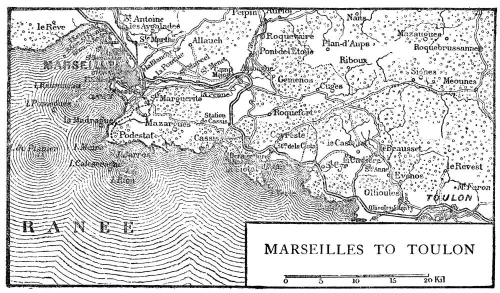 Particularly are the byways of Old Provence unknown to the average English and American traveller; the wonderful Pays d’Arles, with St. Rémy and Les Baux; the Crau; that fascinating region around the Étang de Berre; the coast between Marseilles and Toulon (and even Marseilles itself); the Estaque; Les Maures; and the Estérel; and yet none of them are far from the beaten track of Riviera travel.