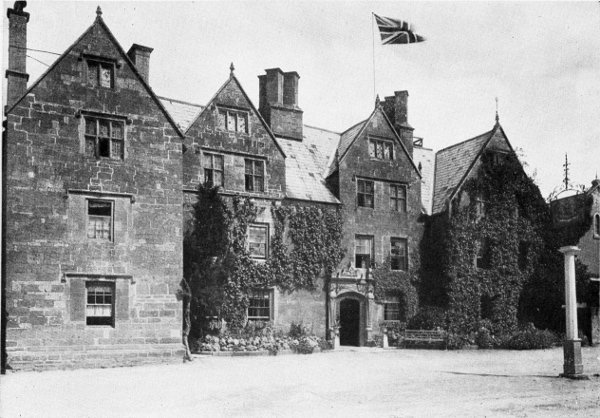 There is not much of historic interest in Bury aside from its abbey and churches. One may occupy a pleasant hour or two in walking about the town, which, despite its antiquity, has a prosperous and up-to-date appearance. Twice in the course of our rambles we visited it and on both occasions our route led to Ipswich, though over different roads—first due south through Lavenham and Hadleigh and later by the way of Stowmarket. The former route is mainly through the retired Suffolk byways, not in the best condition, but bordered by charming country. Nowhere did we see a more delightful brick-and-timber house than the old manor at Brent Eleigh, though it has degenerated into a mere farm tenement rather better cared for than usual. What a[Pg 20] world of quaint and ancient beauty there is in its many red-tiled gables surmounted by great clustered chimneys, its double mullioned windows and its black-oak and red-brick walls, splashed here and there with clinging masses of ivy. Our illustration only half tells the story, for it does not give the color or the most picturesque view of the house. We also came across Bildeston, a little out-of-the-way hamlet lost in the hills, which has many old houses not as yet fallen into the clutches of the restorer. This is also true of Hadleigh, a little farther on the road, which is rich in seventeenth century houses with fronts of ornamental plaster and carved oaken beams. Among the very oddest of these is the guildhall, standing quite apart in a graveyard thickly set with weather-worn headstones.