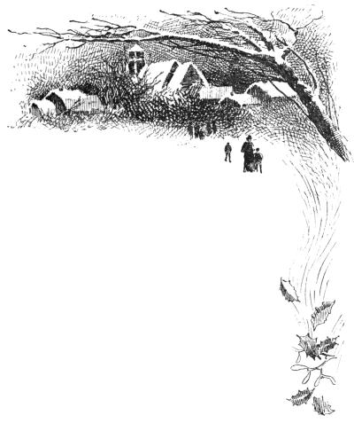 It said no more. Mr. Broadstreet, who, when a child, had often longed to peep behind a picture, found himself actually fulfilling his wish. As he drew nearer the printed page, he heard a dull roar, like surf beating upon a rocky coast. He advanced further, picking his way around the pile of poultry and vegetables and glistening holly upon which the Ghost sat enthroned. A moment more and the room vanished in utter blackness of night, the roar grew grander and deeper, until it throbbed in his ears like the diapason of a mighty organ, a fierce blast of snow-laden wind struck his bewildered face, the street-lamp upon the corner flickered feebly in a mist of flakes—he was standing before his own door, knee-deep in a snow-drift, and buffeted above, below, and on every side by the storm that was abroad that Christmas Eve.