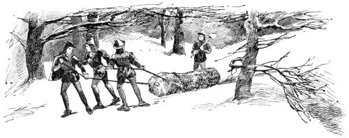 At that moment they were passing through a belt of woods where the brightness of the sky and the faint light of the rising moon made the shadows cower thick and black beside every log and snowy mound.