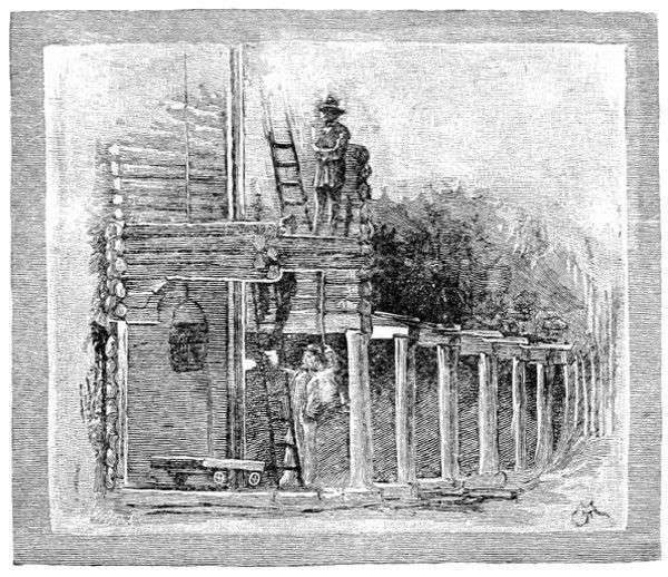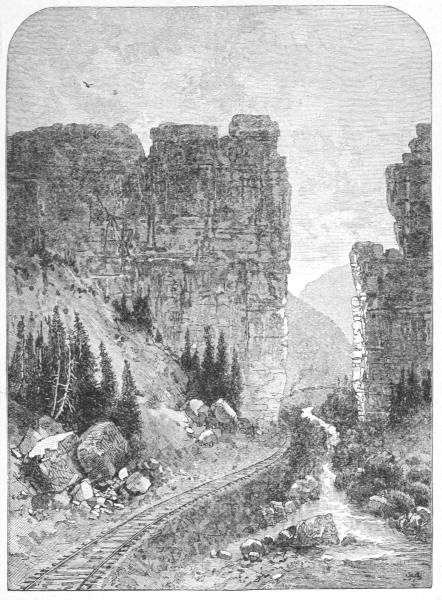 It is by splitting to pieces these great detached droppings of the cliff—solid fragments of the original granite cliff,—that the contractors get the fine building stone of the Mormon temple in the city. There is no need to open any quarries. It is only necessary to drill and blast these big stones lying on the surface, and the demands of a hundred temples would not exhaust the supply. Men were at work as we passed, splitting out blocks that were dragged by stoneboats, or sent along the tramway down to where they could be loaded upon the railroad cars. Until three years ago every bit of this stone was hauled all the way to Salt Lake City by bullock teams, and the great expense and labor account both for the large expense and the slow progress of the mighty structure.