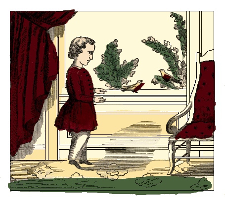 Little Henry took his book one day and went into the garden to study. He sat where the arbor cast a pleasant shade, and he could smell the fragrance of the flowers that he himself had planted. At times, he would forget his book while listening to the music of the birds, or gazing at the peonies and tulips, but he would soon think again of his lesson, and commence studying with new zeal. He was to recite in an hour, so he had wisely chosen a comfortable place, and bravely resolved to conquer his lesson as soon as possible. All at once the yellow cat, which had been watching on the wall, sprang at a beautiful red bird and tumbled down with it at Henry's feet. He started and caught the bird away from the furious cat, but some of its bright feathers were flying about on the ground, and one wing was so hurt that it could not fly, so he ran into the house and told the story to his mother. She pitied the poor little thing, and brought an old cage from the garret, where, placing the bird softly upon the perch, she fastened it in so as to have no more trouble from the cat. It was well that Henry had learned his lesson, and was able to repeat it to his mother, for now he could think of nothing but the bird. He gathered chickweed and flowers to place in its cage, and gave it water and some crumbs and seeds. For a long time it seemed too ill to eat, and when at last it picked up a few seeds, he danced about the room for joy.