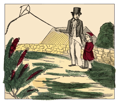 Proudly it soared away until the yellow star upon it looked smaller than the morning star that had peeped in at Henry's window, and as they watched it moving through the air like a bird, his father told him that Benjamin Franklin, a philosopher, once tried an experiment with a kite, by which he discovered the nature of lightning. Henry said he thought Benjamin Franklin was a little boy that paid all his money away for a whistle. "So he was," said his father, "but he learnt wisdom by his mistakes, and that made him a philosopher." Henry wanted to hear all about the experiment. So his father told him how Franklin made his kite with an iron point at the top, and the string of hemp with the lower part of silk, and a key fastened where the two were tied together, and how he raised it in a thunder-storm, and the iron drew the lightning which passed down the hemp-string to the key, but no further, because it could not pass down a silken string; that he then drew it down so as to touch the key, when he received a spark like that from an electrical machine, which showed that electrical sparks are of the same nature as lightning, which no one knew before, and which was a great and useful discovery. Henry was pleased with the story, but when his father told him that another man trying the same experiment afterwards, was killed by the lightning, the little boy said that he should not care about trying it himself.