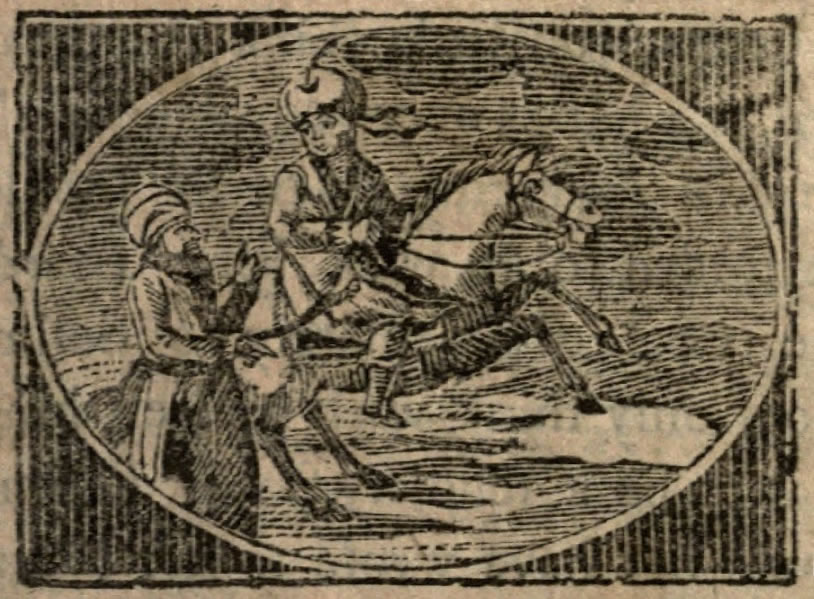 Fatima had a real love for Selim, to whom her father had promised his consent in marriage. You see promises with some, like pye-crust, is made to be broken. Ah! silly[pg 11] old man, you little think about the evil that hangs over your daughter's head. As Fatima knew she should be forced to go with Blue Beard, she wrote immediately to Selim. Now only think what a fine thing it is to be a scholar, for if Fatima could not have wrote to her lover, nobody else would have done it for her, and what would have been the consequence you will find by and by; so above all things learn to read your book, that your daddy and mammy may learn you to write too; well as soon as she had finished her letter, she gave it to a trusty messenger, who set off full speed and soon arrived at Selim's house. I must now return to Blue Beard, who could not get a wink of sleep all [pg 12]night, so much did he think of his intended bride: so, no sooner had the sun gilded the mountain's tops than he was up, and the procession was ordered to move towards the village; you can think what a fine sight it was, first came two trumpeters, then two kettle-drums, then two French horns, then two men with fine silken flags, then some of his black slaves armed with bows [pg 13]and arrows; next came the great Abomelique himself, riding on an elephant, under a fine silken canopy; next followed another elephant richly dressed, with a fine seat on his back, with a silken canopy over it, for Fatima and her sister; a fine Arabian horse followed, led by a black slave, for her father; a band of music following; then his slaves armed with bows and arrows, closed the procession. Blue Beard brought some fine clothes along with him for Fatima and her sister, which the father insisted upon her wearing. It was in vain for her to tell him she could not be happy, as her heart was given to Selim; he knew that Blue Beard was very rich, and like many others, he thought happiness [pg 14]consisted in wealth; so, says he, have him you must, and have him you shall: Abomelique, at the same time, took all manner of pains to please her; for, beside the fine clothes, he brought her jewels and diamonds in profusion, and promised she should want for nothing when she got to the castle.