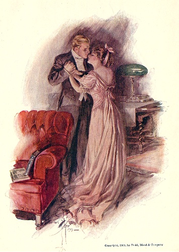 "Lean over," she said. He did so. Very daintily, very deftly she pulled the stray wisps of cotton from his hair, so deftly, in fact, that he scarcely felt the touch of her fingers, although his whole being thrilled with the delicious sensation of contact. For years he was to remember that infinite minute and a half. He knew how pleased Samson must have been while his strength was being shorn, even though the parable says he slept.