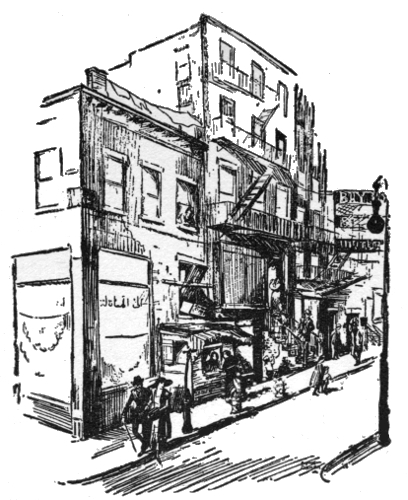 Near Eighth Avenue, before Fortieth Street. The smell of garlic and tomato sauce warns the passer-by that the inhabitants are from Piedmonte, but on the street one hears the Irish brogue. The bales of cotton in front of the warehouses and the smoke from the chimneys reek after Liverpool, but the smell of rope, tar and fried smelts that comes from the wharves near by remind one of Fiume and Marseille, as the swaying masts and the spread-out sails outline themselves against the glowing sky.
