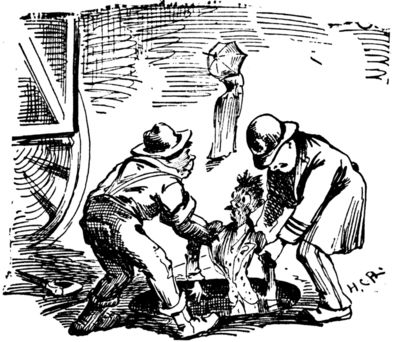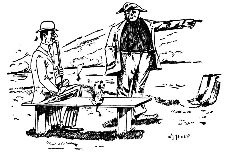 Old Farmer (climbing the fence and approaching the buggy)—Beg pardon, I'm a little hard o' hearin'. What is it?